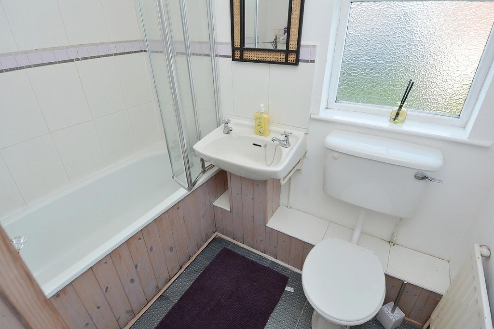 BATHROOM White suite comprising panelled bath with telephone hand shower; low flush WC; pedestal wash hand basin; built-in hot press and storage shelving; single panel radiator.