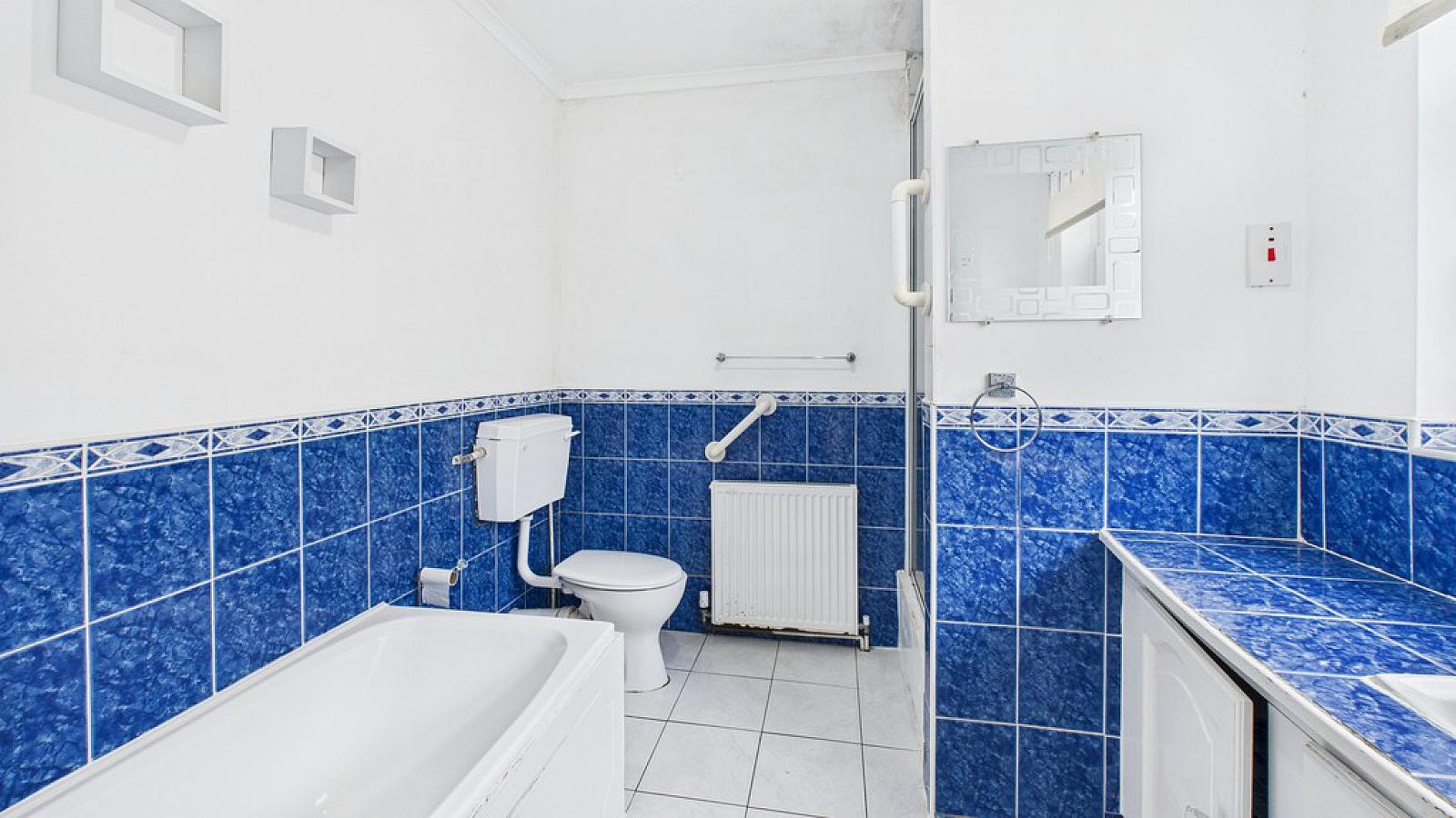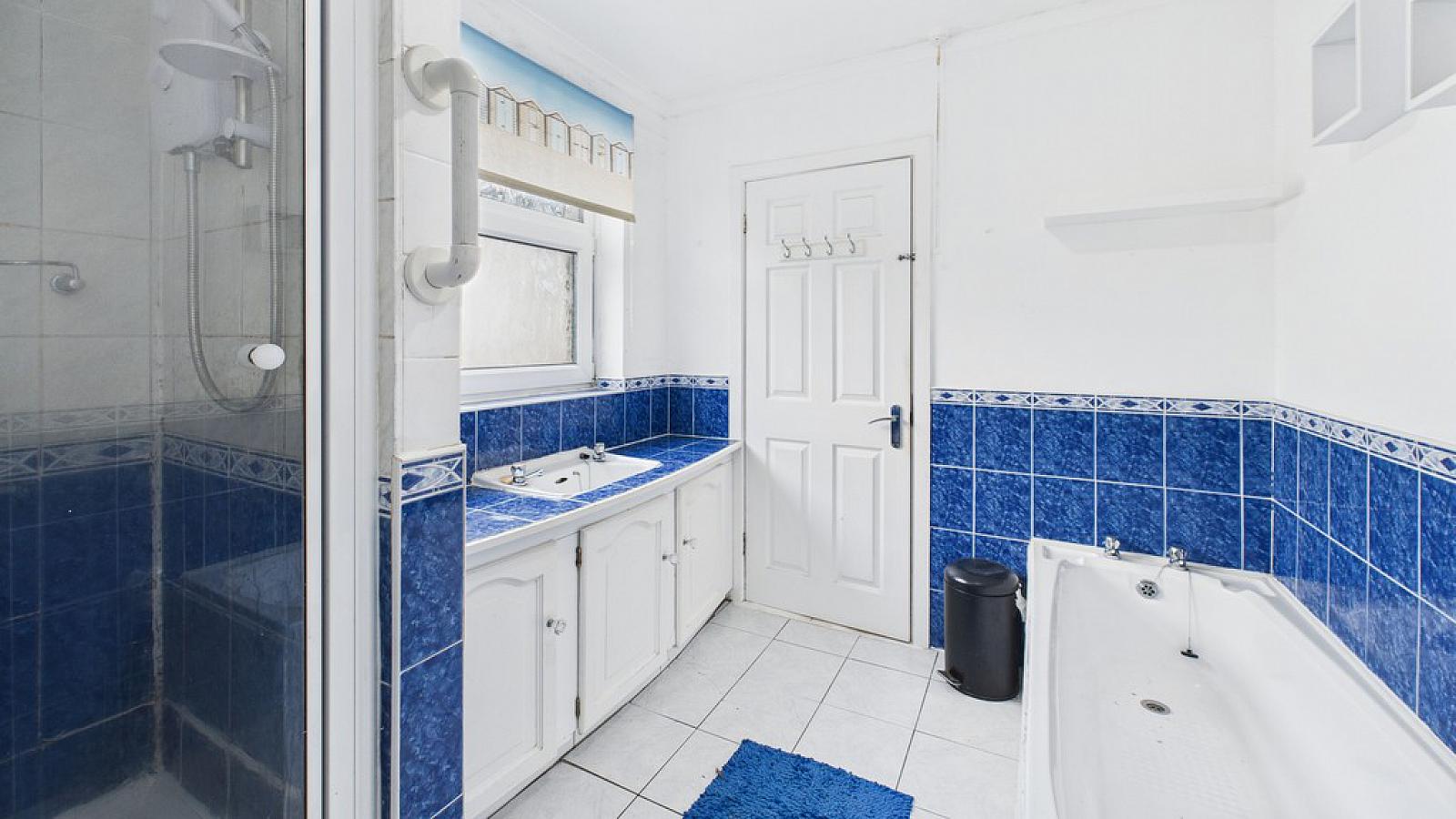 BATHROOM Suite comprising panelled bath; corner shower cubicle; vanity sink unit; low flush WC; double panel radiator; tile floor.