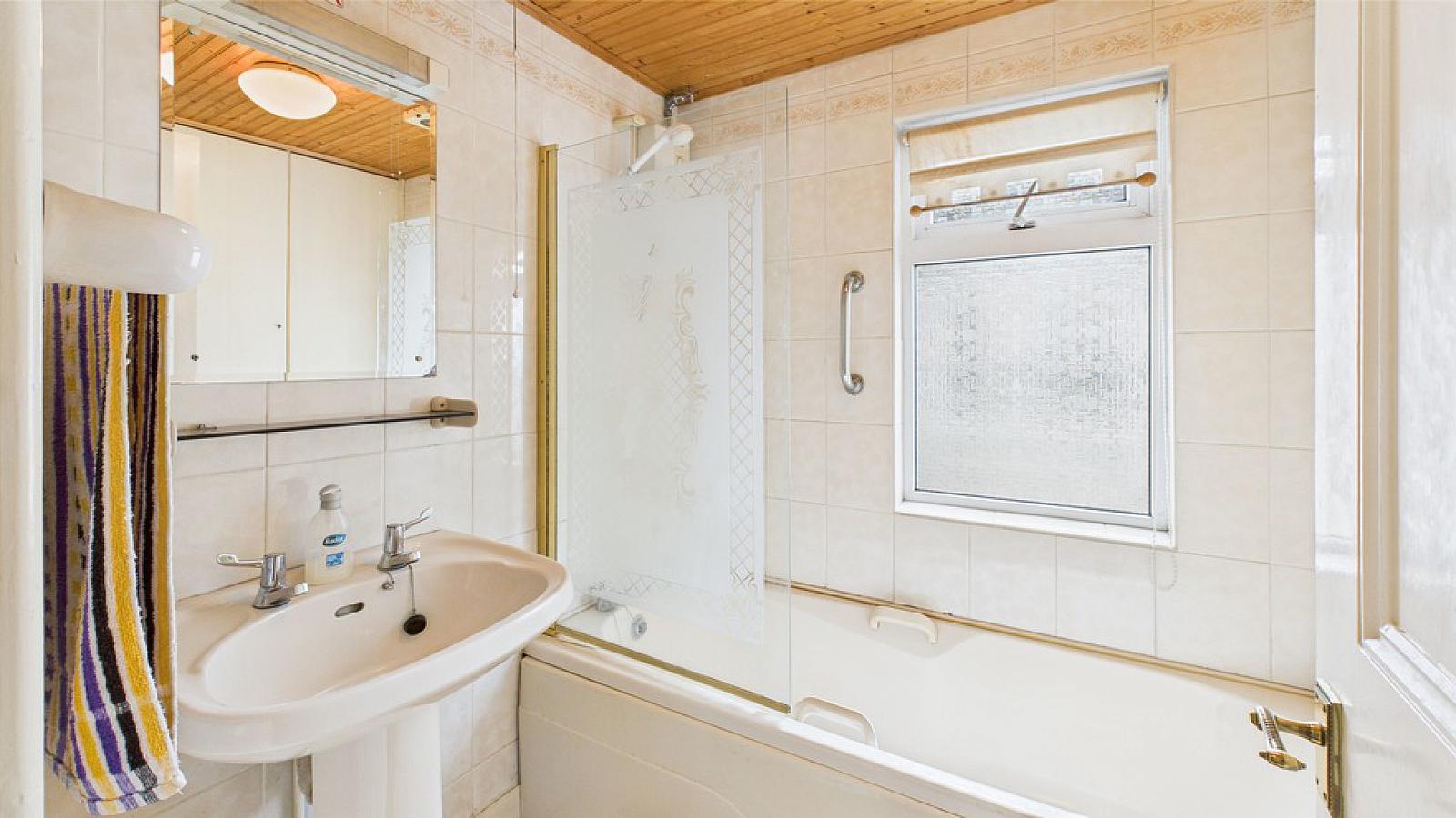 BATHROOM Panelled bath with electric shower over; pedestal wash hand basin; built-in hot press and storage shelving.