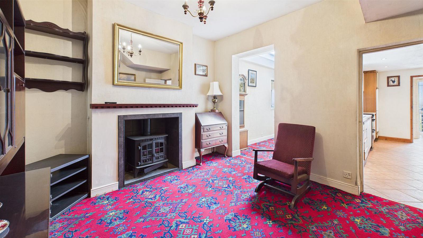 FAMILY ROOM Feature gas stove; single panel radiator; open plan to dining area.
