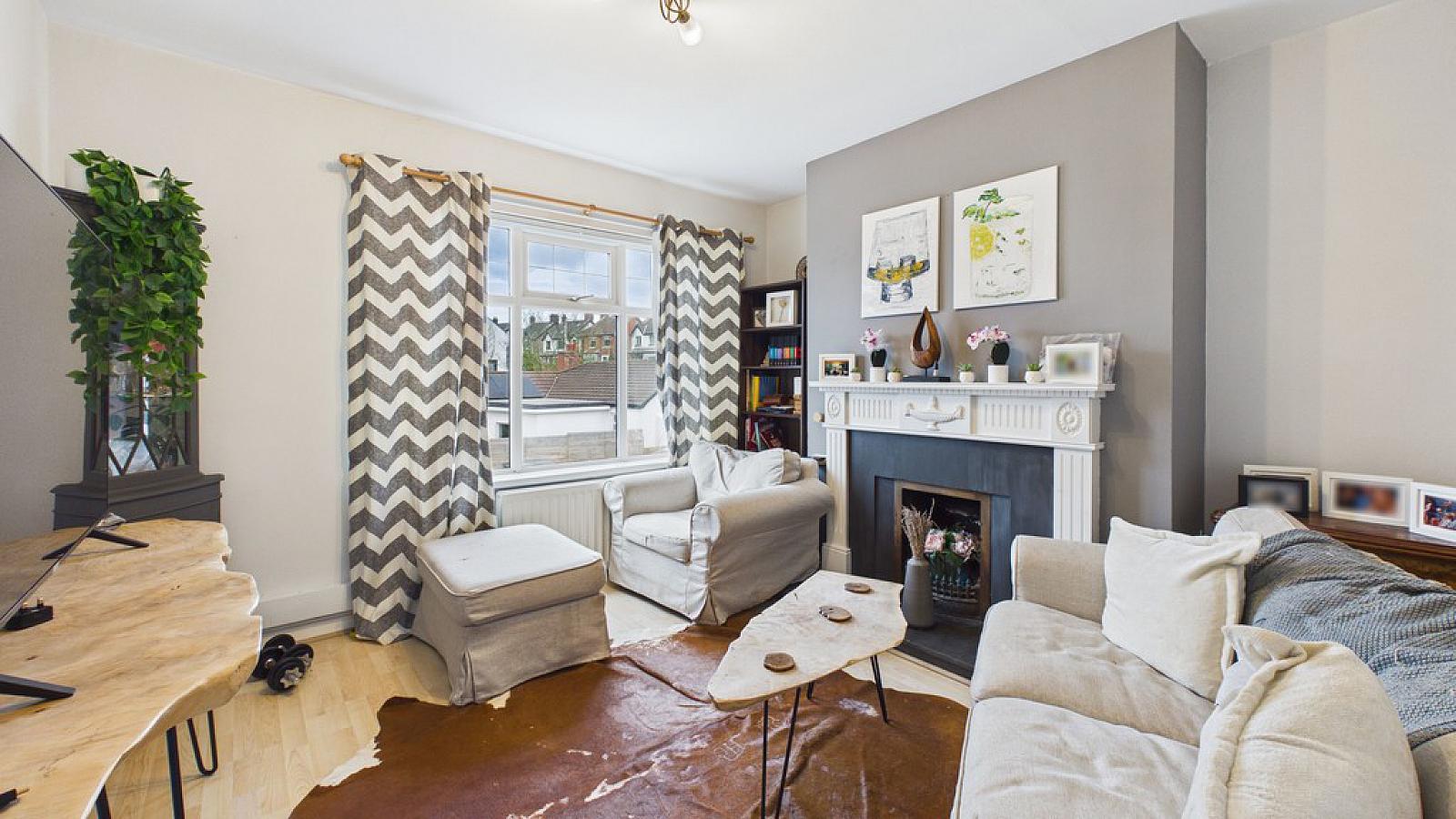LIVING ROOM 11' 10" x 11' 9" (3.61m x 3.58m) Feature open fireplace; wood laminate floor; double panel radiator.