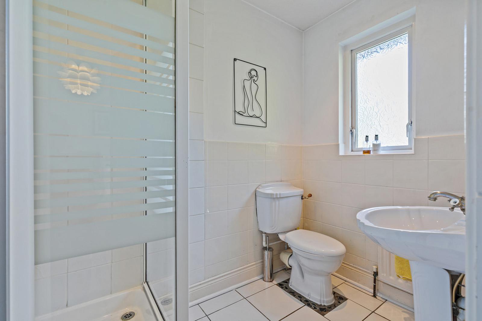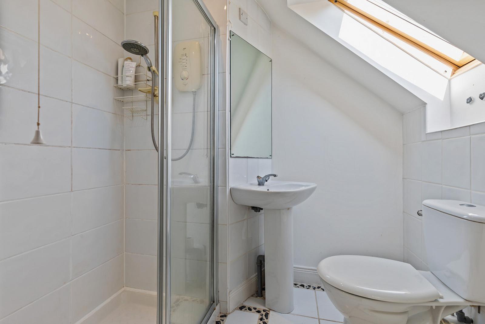 EN SUITE SHOWER ROOM Corner shower cubicle with electric shower; low flush WC; pedestal wash hand basin; tile floor.