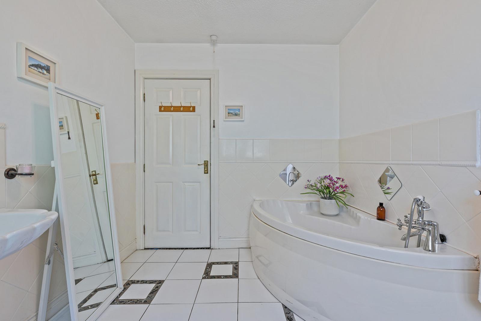 BATHROOM Suite comprising corner panelled bath with telephone hand shower; low flush WC; pedestal wash hand basin; tile floor.