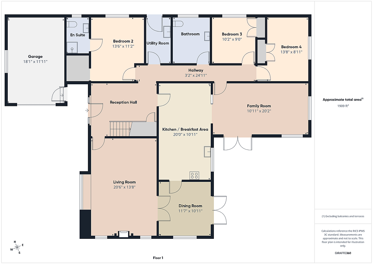 KITCHEN / DINING AREA 20' 0" x 10' 11" (6.1m x 3.33m) Bespoke kitchen with a range of high and low level units and granite work surfaces; five ring gas hob and electric under oven; sink unit and side drainer; integrated dishwasher; integrated side board; integrated booth seating; tile floor; open plan to family room.