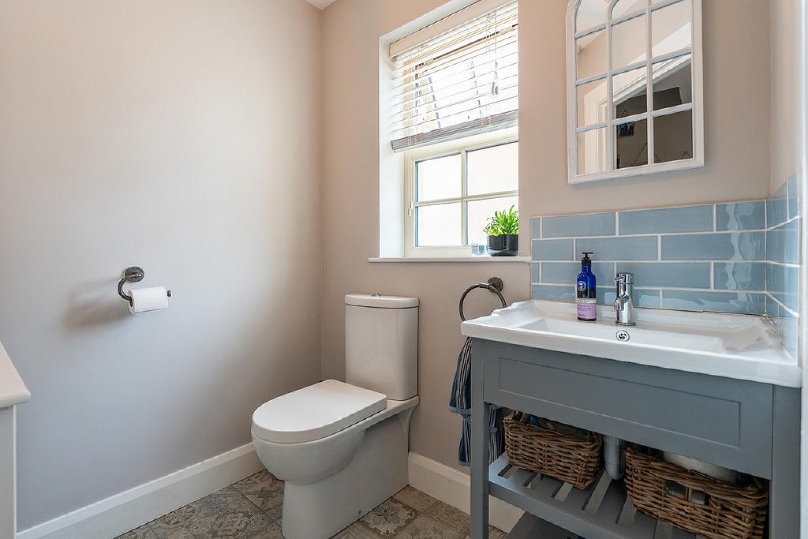 DOWNSTAIRS WC Suite comprising vanity sink unit; dual flush WC; tile floor; single panel radiator.