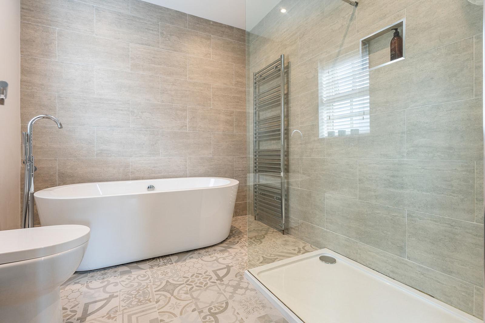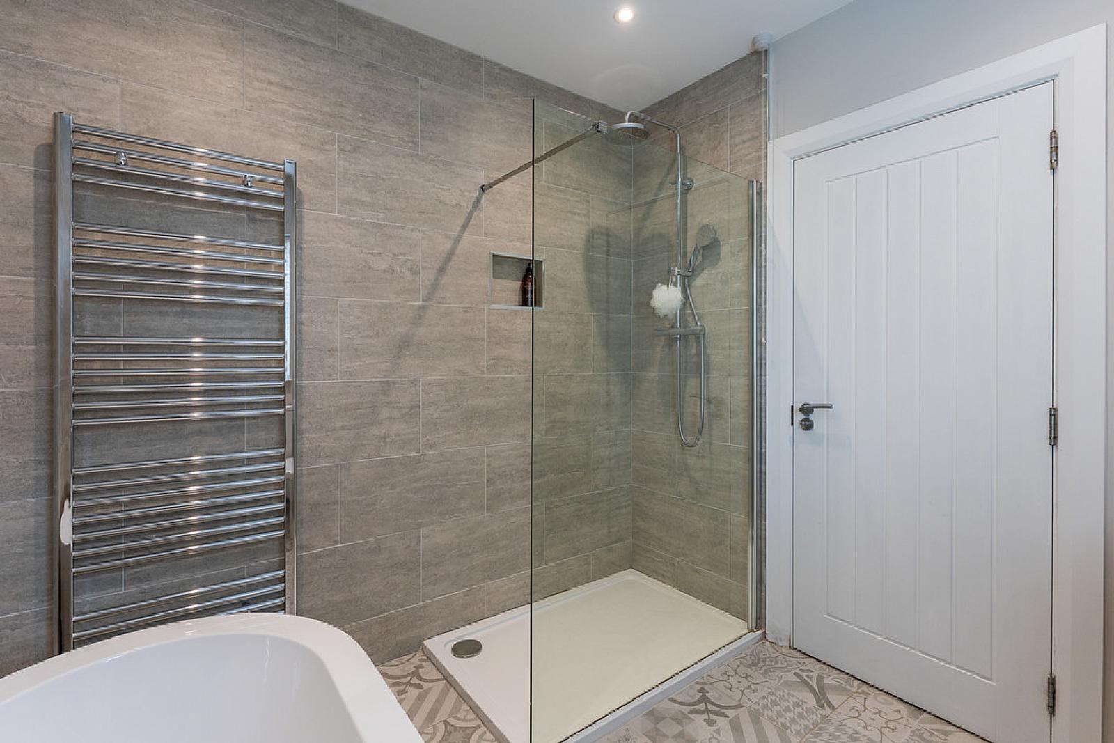 FAMILY BATHROOM Suite comprising oversized shower cubicle with thermostatic shower; free-standing bath; vanity sink unit; dual flush WC; tile floor; heated towel rail.