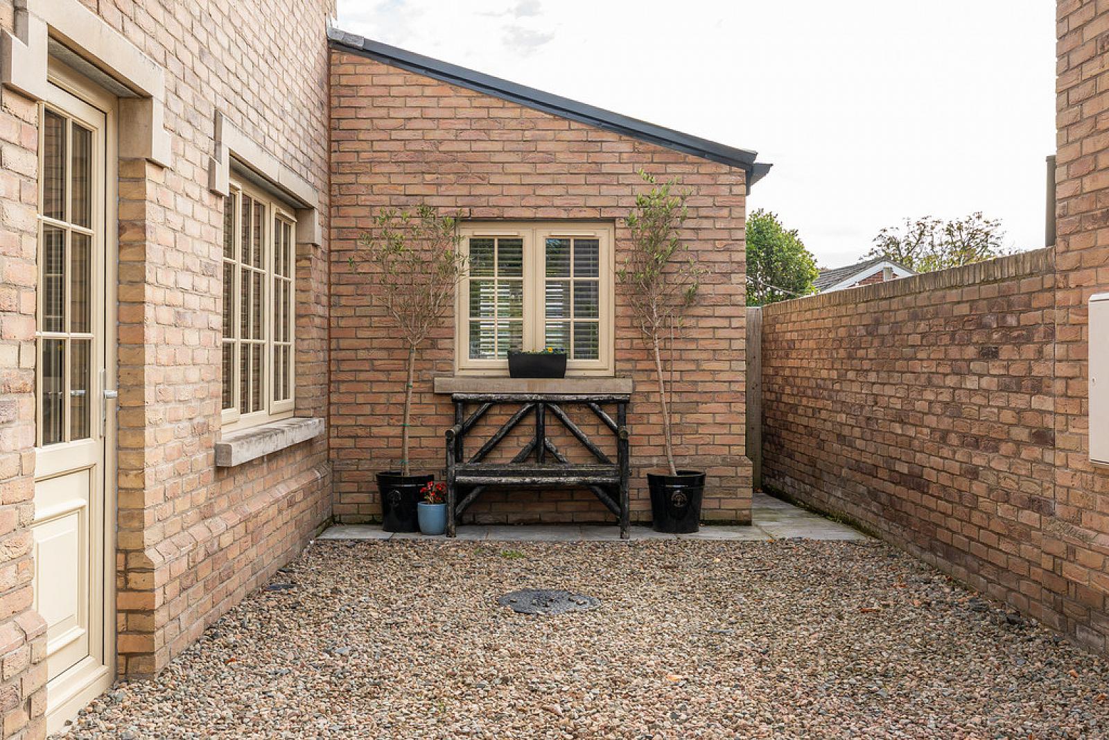 OUTSIDE Enclosed landscaped garden with a paved patio, shrubs and trees; access to front garden and driveway.