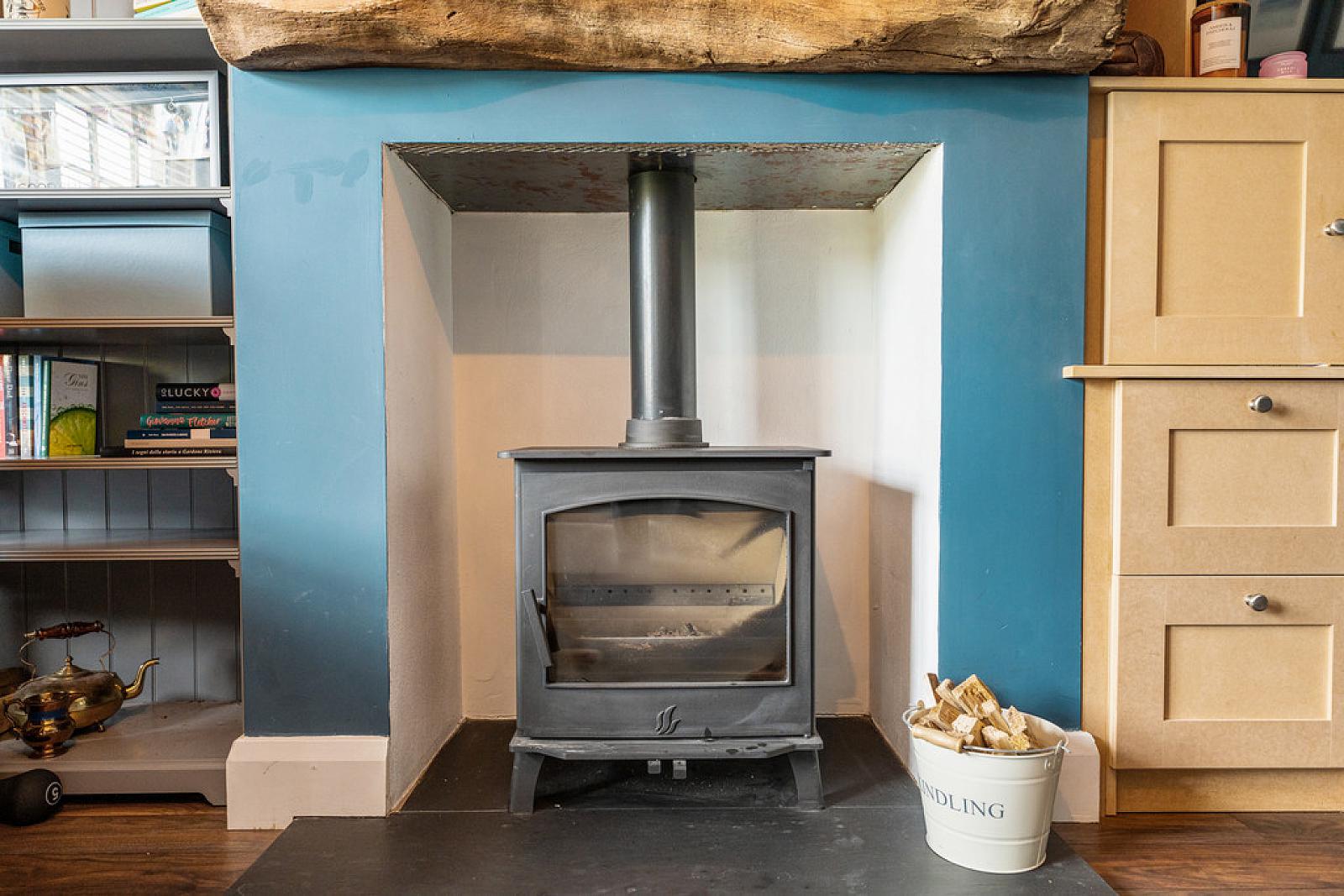 Living room with cast iron stove