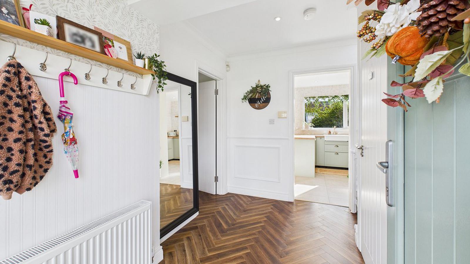 ENTRANCE HALL Engineered herringbone wood floor; double panel radiator.