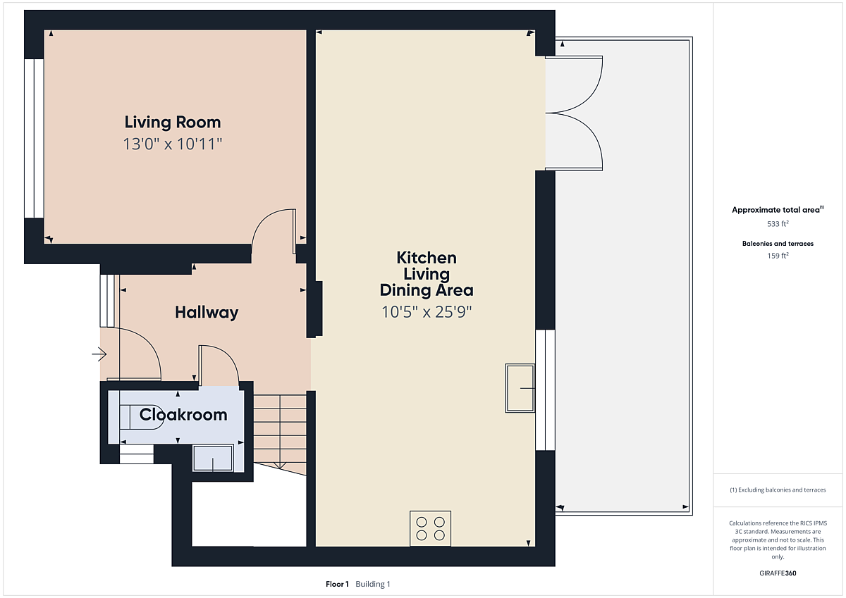 MODERN KITCHEN / LIVING / DINING AREA 25' 9" x 10' 5" (7.85m x 3.18m) Recently fitted kitchen with complementary work surfaces; Belfast sink; integrated fridge / freezer; integrated dishwasher; four ring ceramic electric hob and under oven; integrated booth dining area; part tile floor; part engineered herringbone wood floor; sliding door to rear garden.