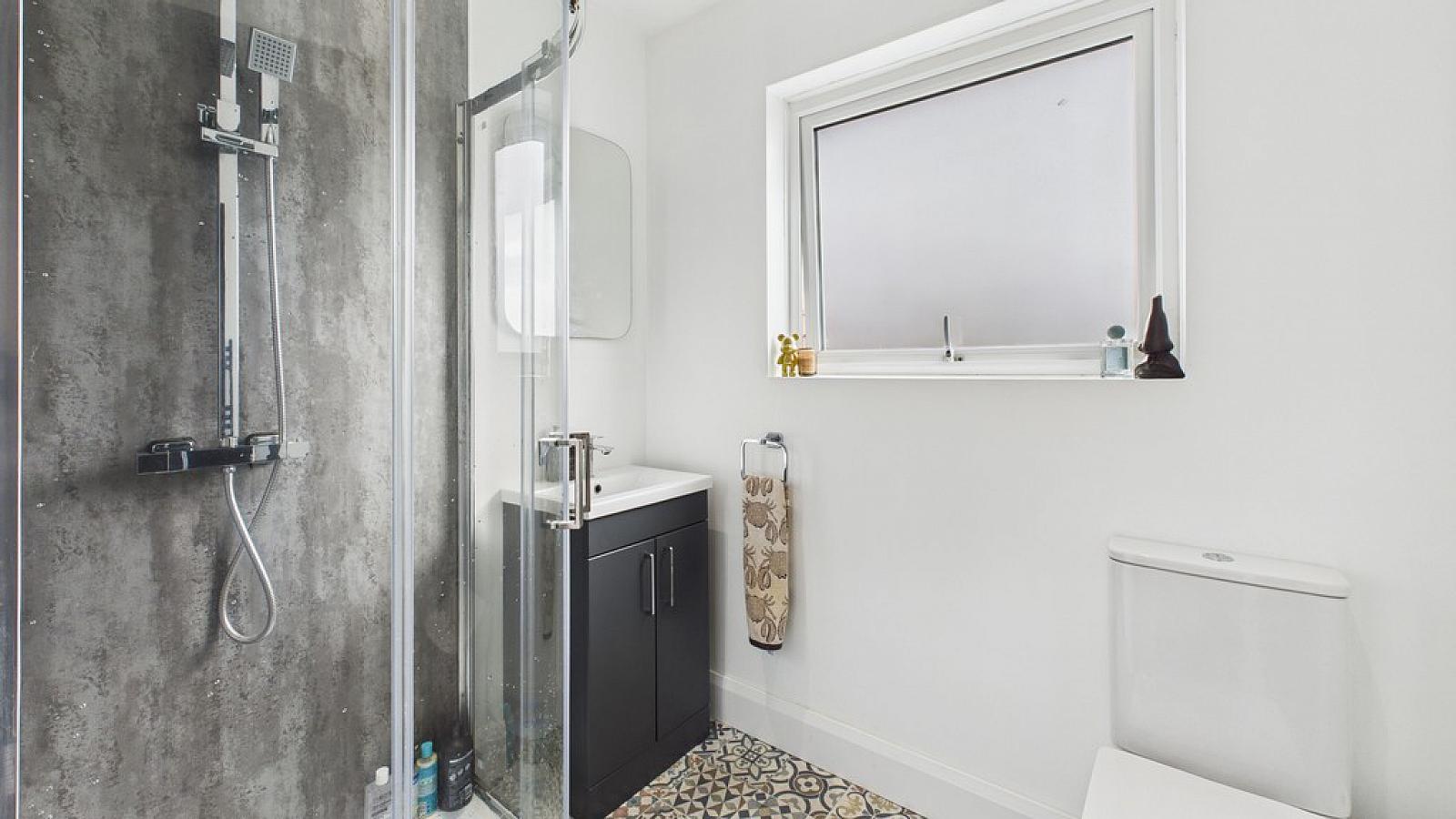 SHOWER ROOM Modern suite comprising a corner shower cubicle with thermostatic shower; vanity sink unit; dual flush WC; heated towel rail; tile floor.