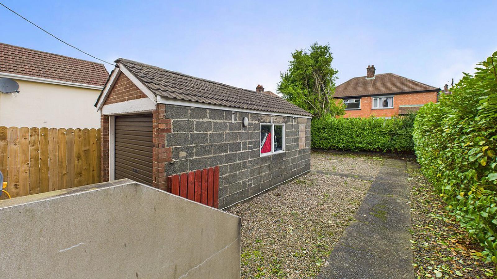 OUTSIDE Driveway leading to a detached garage and rear garden.