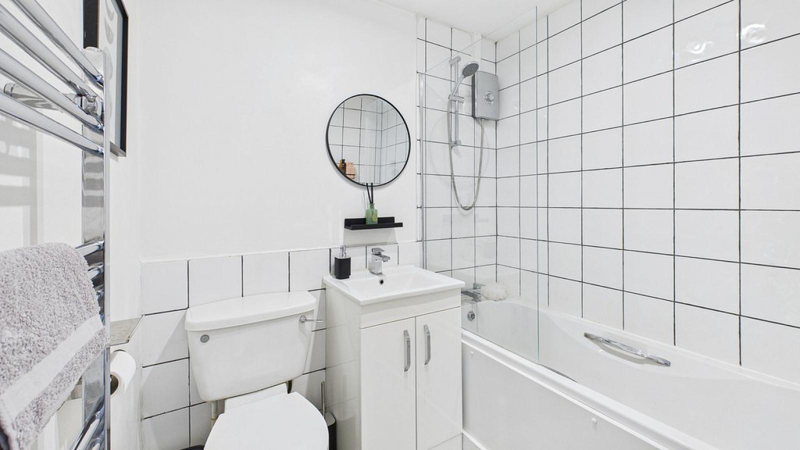 BATHROOM Suite comprising a panelled bath with electric shower over; vanity sink unit; low flush WC; heated towel rail; partly tiled walls.
