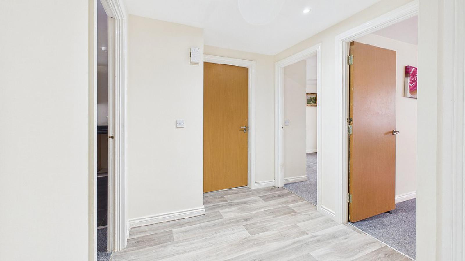ENTRANCE HALL Wood laminate floor; single panel radiator; built-in storage cupboard.