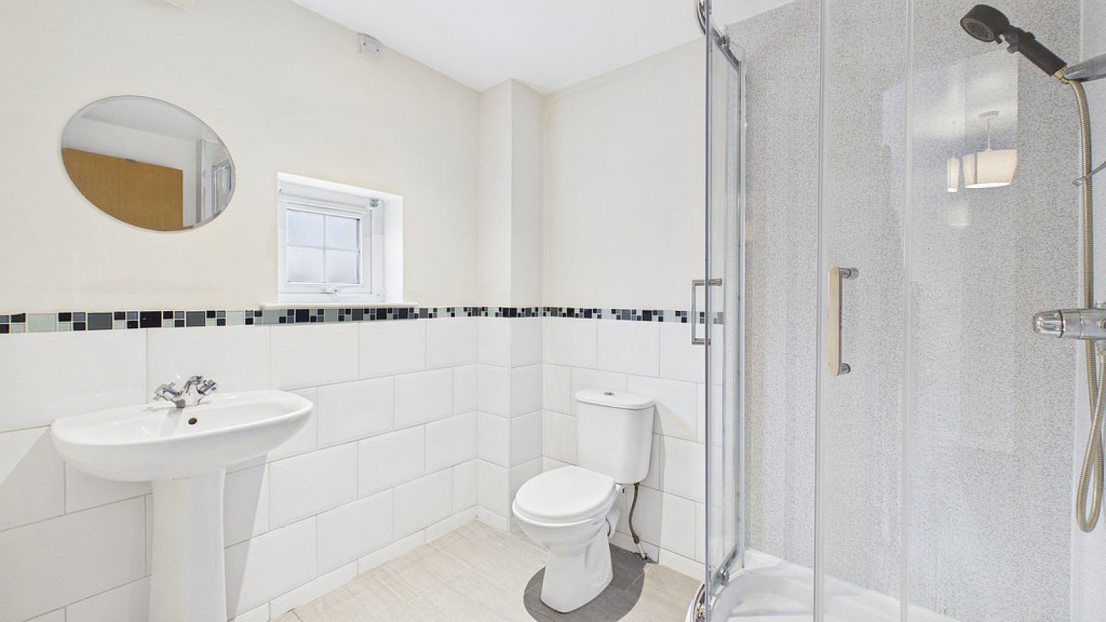 EN SUITE SHOWER ROOM Suite comprising corner shower cubicle with thermostatic shower; dual flush WC; pedestal wash hand basin; tile floor; single panel radiator.