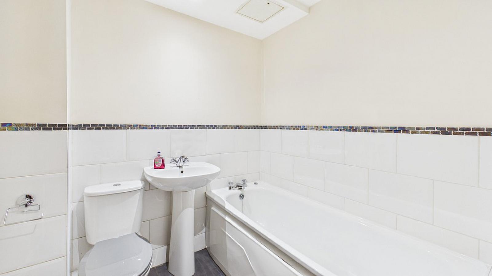 BATHROOM Suite comprising panelled bath; dual flush WC; pedestal wash hand basin; single panel radiator; tile floor.