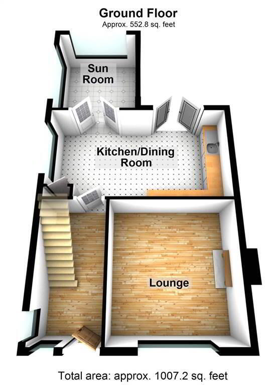 With deceptively spacious accommodation over two floors, the Ground Floor comprises of two receptions – a Principal Lounge and a rear aspect Sun Room – and a fitted Kitchen with space for dining as well as access to the Rear Garden.