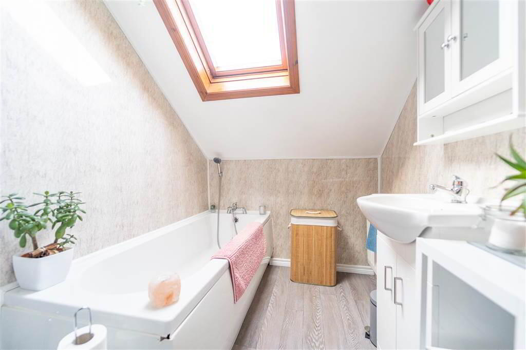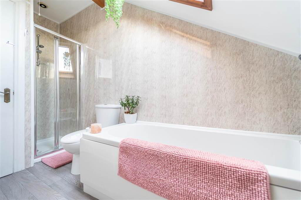 - 3.66m x 1.73m (12' 0" x 5' 8")Modern Bathroom with a white four-piece suite comprising a Panel Bath, a Push Button W.C., a Pedestal Wash Hand Basing and a Shower Cubicle with Electric Shower Unit. Complete with PVC Panel Walls.