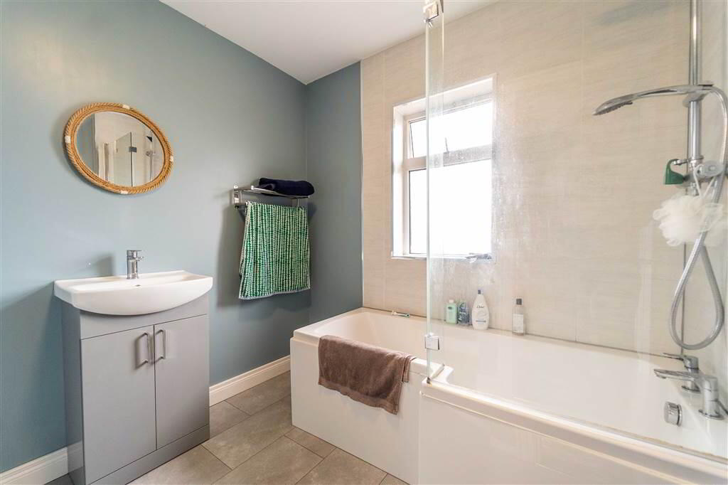 - 2.64m x 2.39m (8' 8" x 7' 10")Recently fitted modern Bathroom with a white three-piece suite comprising a ‘L’ shaped Bath with Mains Shower and wall panels, a Push Button W.C. and Wash Hand Basin with storage under.
