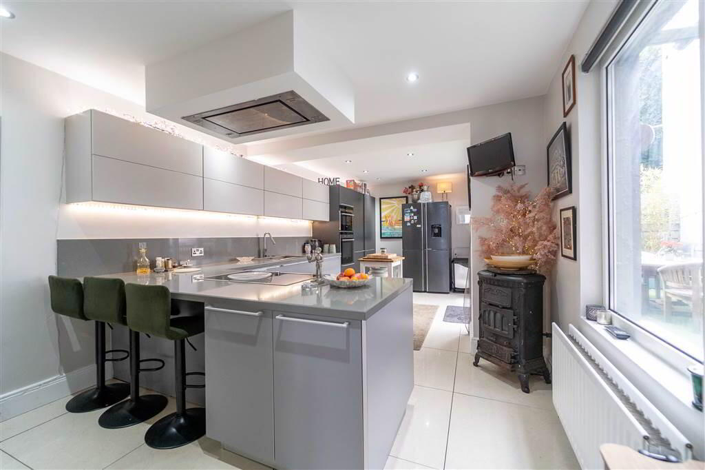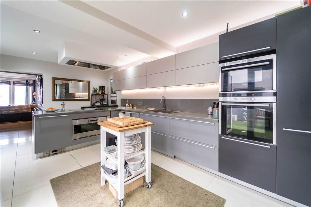 - 6.81m x 3.38m (22' 4" x 11' 1")Spacious modern fitted Kitchen, with casual dining area, complete with tiled flooring. The Kitchen is fitted with a range of high and low level with complimentary worktops extending to a Breakfast Bar. Integrated appliances include dual Ovens, an Electric Hob with further Oven under, a Stainless-Steel Sink Unit and Dishwasher. From the Kitchen double doors lead to the rear enclosed Courtyard.