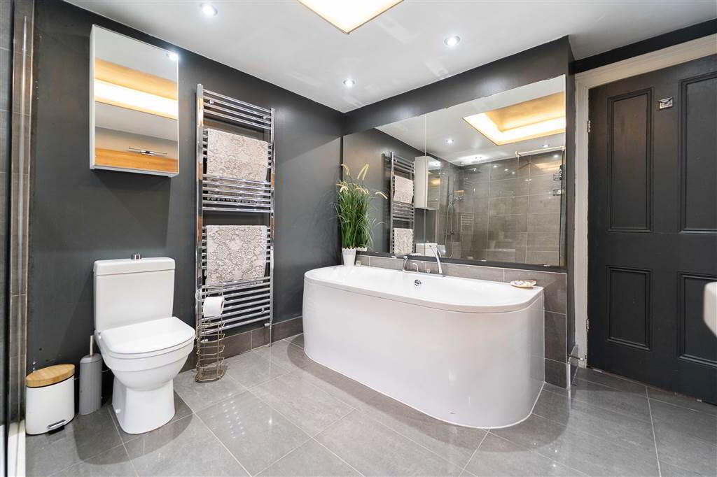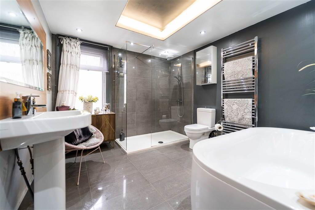 - 3.12m x 2.84m (10' 3" x 9' 4")Contemporary styled Bathroom with a four-piece suite comprising a large tiled walk-in Shower Enclosure with mains Shower into a Drench Head, a Push Button W.C., a rounded doubled ended Bath and a Pedestal Wash Hand Basin. Complete with tiled floor and a feature dropped ceiling with spotlights.