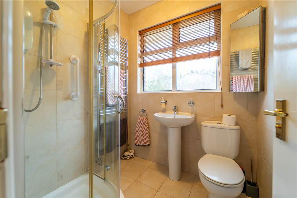 - 1.8m x 1.68m (5' 11" x 5' 6")Three-piece Suite comprising a Pedestal Wash Hand Basin, a Low Flush W.C. and a Corner Shower with a Redring Electric Shower over. Complete with Tiled Flooring, Tiled Walls and a Chrome Heated Towel Rail.
