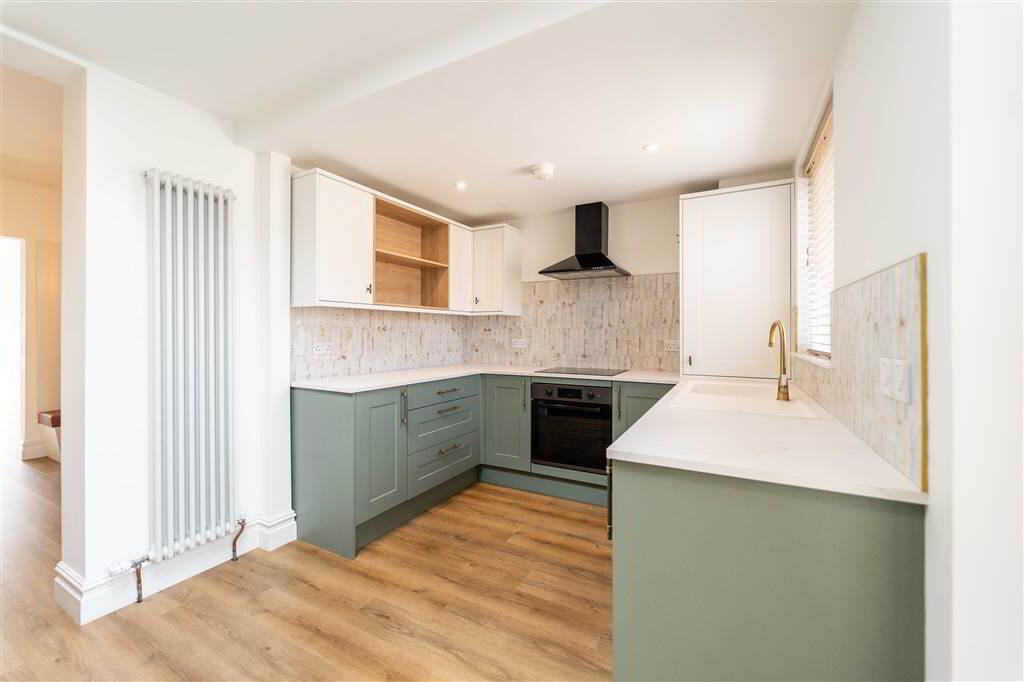 - 4.11m x 2.72m (13' 6" x 8' 11")Modern fitted Kitchen with a range of high-and-low level Units with complimentary Worktops, an integrated Four Ring Ceramic Hob with an Oven under and Extractor Hood over, an integrated Fridge Freezer, a Sink and Drainer Unit, a Velux Window providing ample natural light, recessed Spotlights and uPVC double-Glazed Doors provide access to the rear.