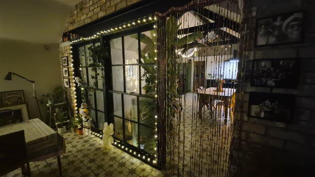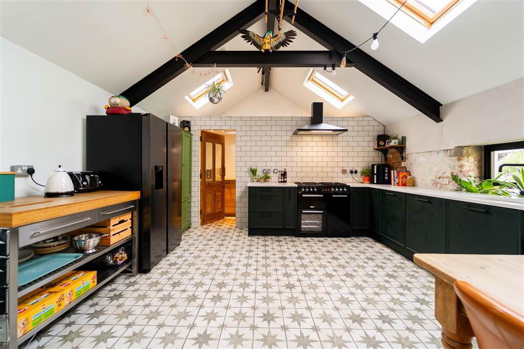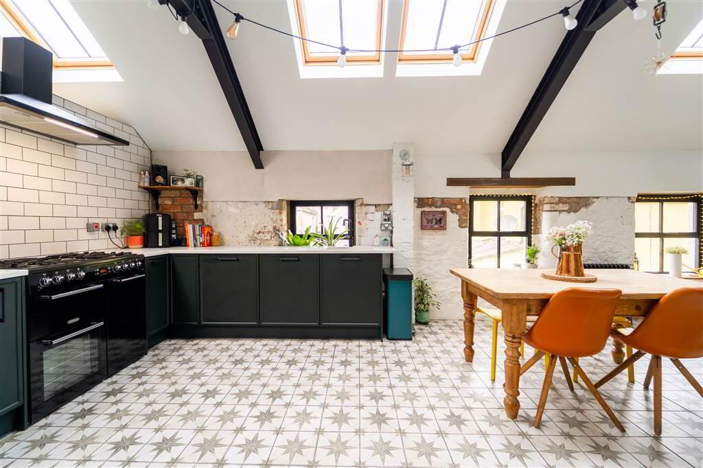 The Kitchen is also tiled and has a vaulted ceiling with exposed steel beams, skylights and exposed brickwork.