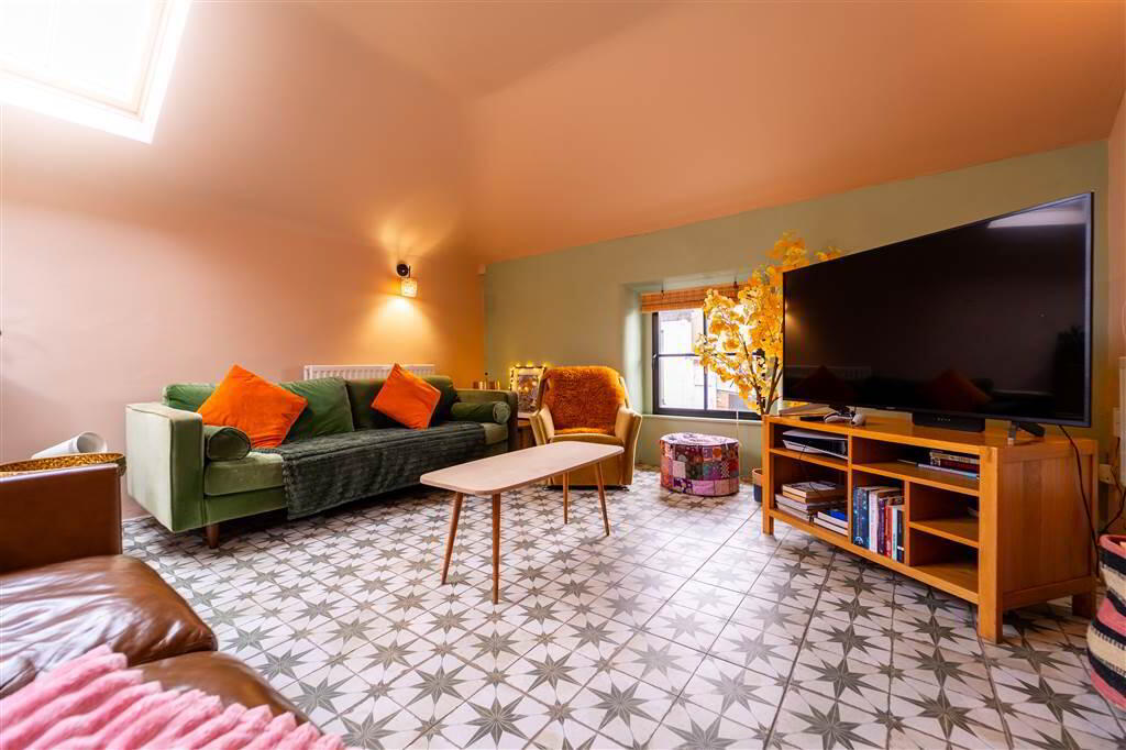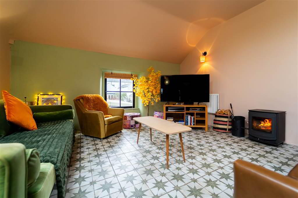 On the first floor is the Living Room which is tiled throughout with skylights in the vaulted roof, exposed red brickwork and a multi fuel stove.