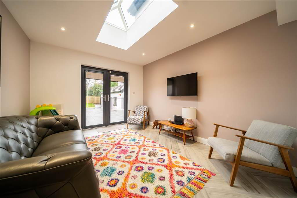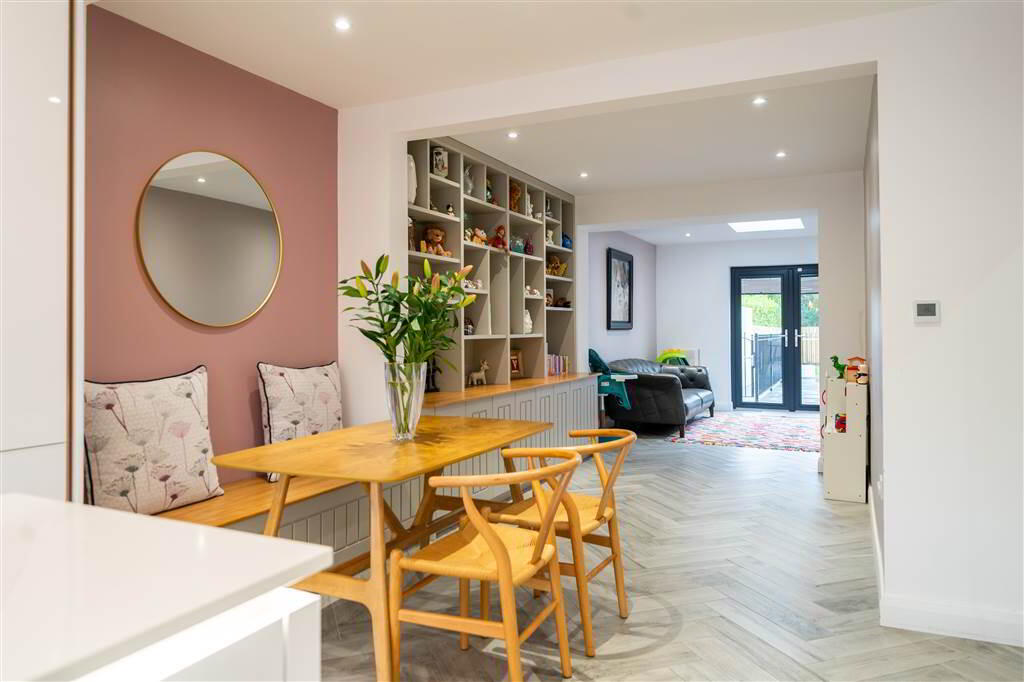 Rear aspect Reception Room with Herringbone Tiled Flooring, fitted Shelving and Storage, recessed Spotlights, a feature Rooflight and uPVC double Glazed Door provide access to the rear Garden. - BEDROOM (4):