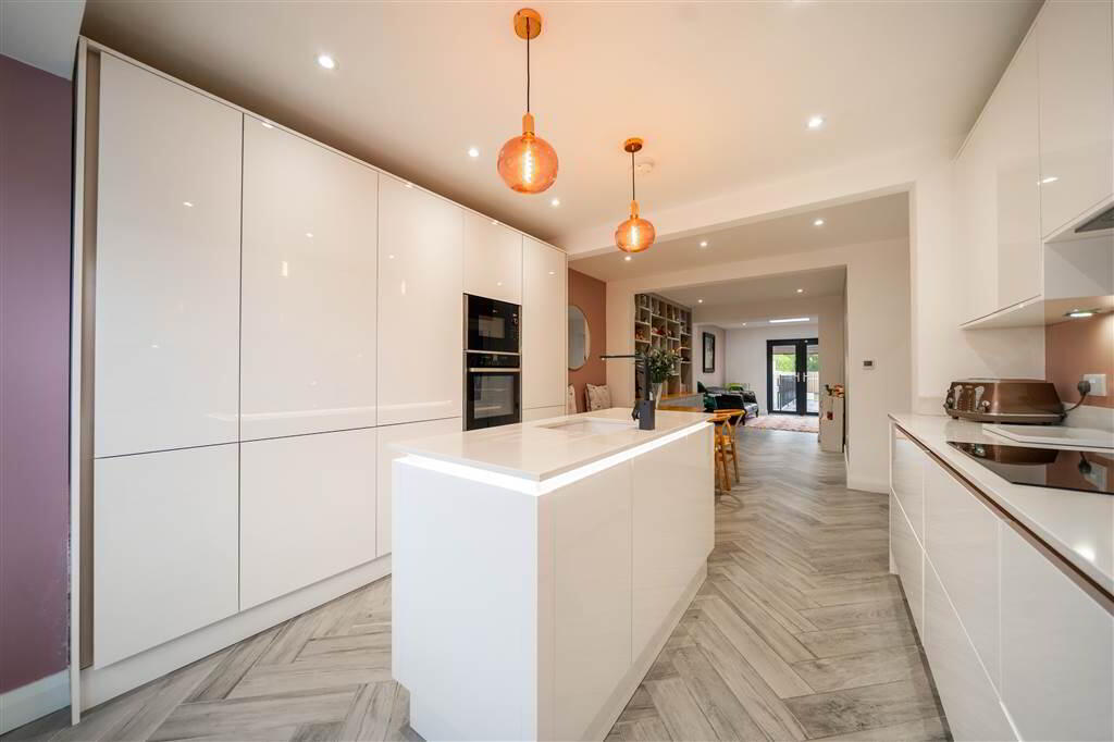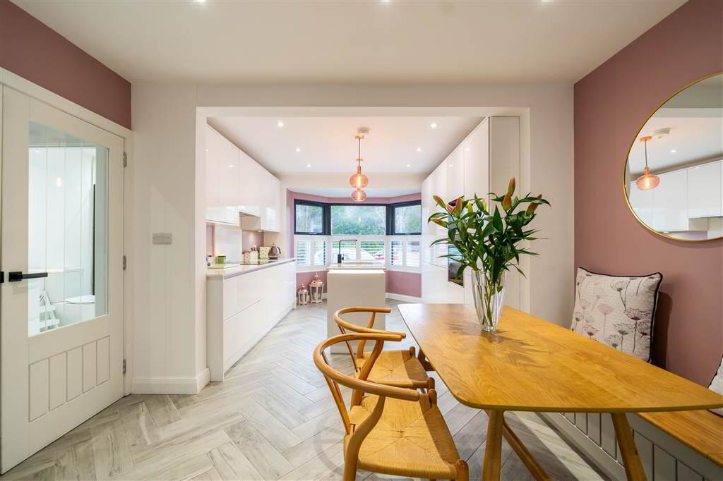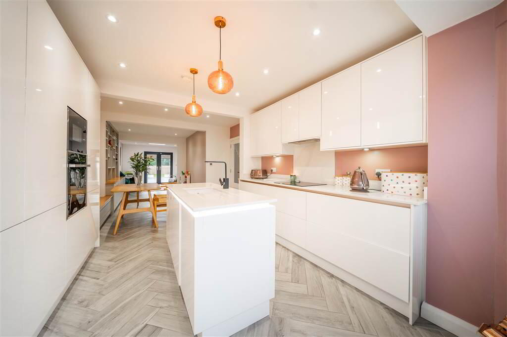 Complete with Herringbone Tiled Flooring, recesses Spotlights, built-in Storage and access to under Stair Storage which is Plumbed for a Washing Machine. - KITCHEN / DINING