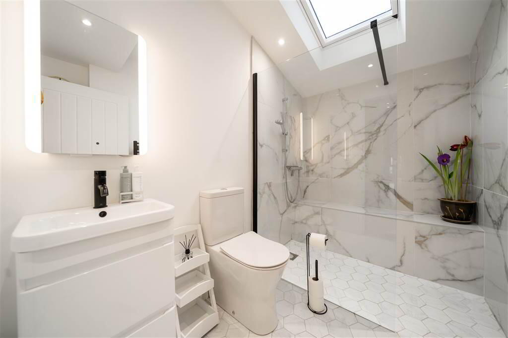 - Deluxe three-piece Suite comprising a walk-in Mains Shower, a Low Flush W.C. and a Sink with storage under. Complete with Tiled Flooring, part Tiled Walls. A heated Towel Rail, recessed Spotlights and a feature Velux Window.