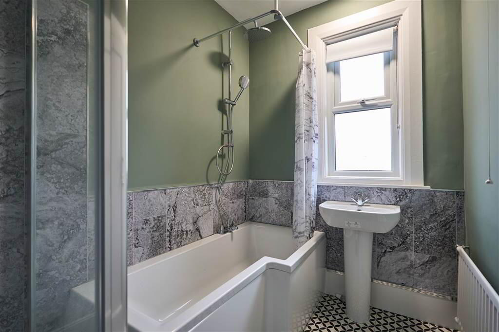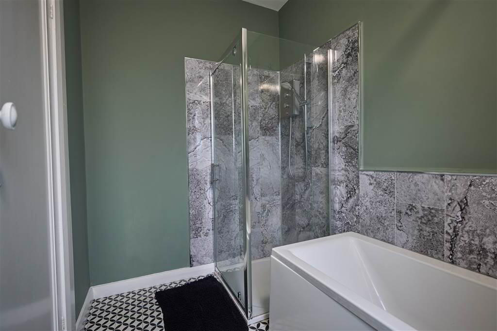 Contemporary styled Bathroom with a white three-piece suite comprising a Shower Cubicle with Mains Shower, a ‘L’ Shaped Shower Bath and a Push Button W.C.. - SEPARATE WC: