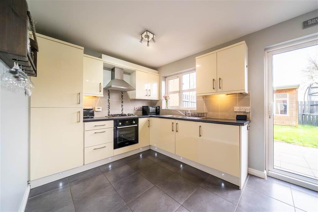 Modern fitted Kitchen with a range of high and low level gloss units with complimentary Worktops, a Stainless Steel Sink Unit, an integrated Gas Hob with Oven under, an integrated Fridge / Freezer and an integrated Washing Machine. Complete with tiled Flooring. The Kitchen opens to provide space for dining, access to a Ground Floor W.C. and sliding doors to the Rear Garden. - W.C.: