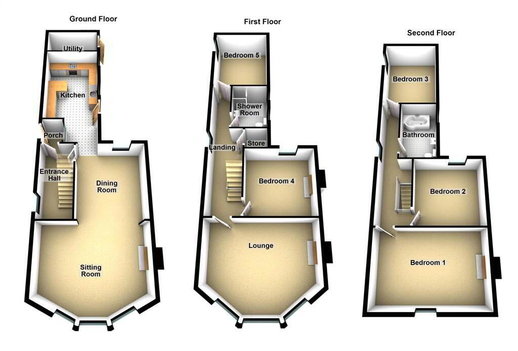 Five Bedrooms (Two First Floor & Three Second Floor)