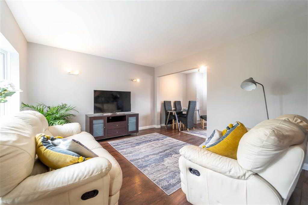 Front Aspect Reception Room with Laminate Wooden Flooring and a feature Bow Bay Window. An Archway provides access to: - DINING AREA