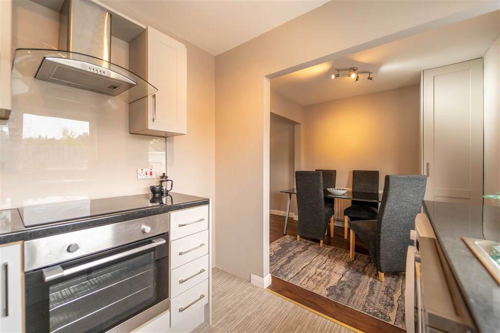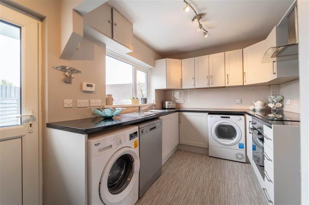 Fitted Kitchen with a range of high- and low-level Units with complimentary Roller Edge Worktops. Complete with an integrated Four Ring Ceramic Hob with an Oven under and an Extractor Hood over, a 1 & ½ Bowl Stainless Steel Sink and Drainer Unit, plumbing for a Washing Machine and space for a Tumble-dryer.