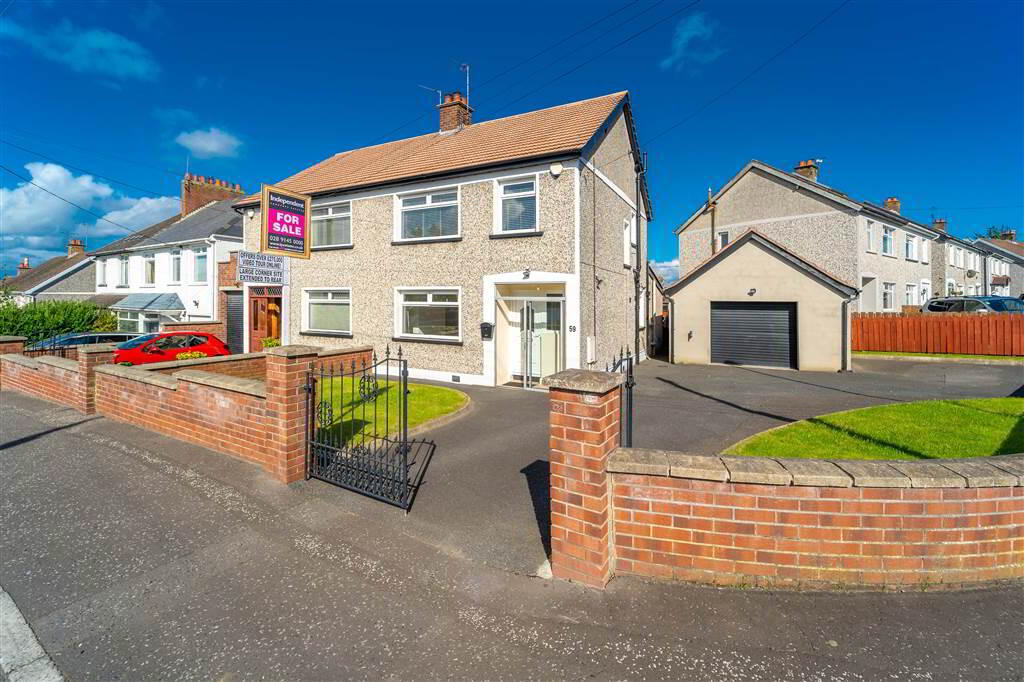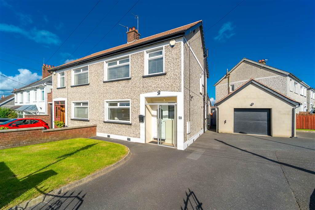 Independent Property Estates are pleased to introduce to the Sales Market Number 59 Windmill Road, Ballyholme, Bangor. This Semi-Detached Family Home is located in a much sought-after area within close proximity of the Ballyholme Village and in turn Ballyholme Beach. Public transport links and Ballyholme Primary School are also close by. Internally, with a total internal area of approx 1150sqft, the Ground Floor comprises a spacious front aspect Lounge, an open plan Living / Dining /Utility area, a fitted Kitchen and a W.C. The First Floor of the Property comprises of three well-proportioned Bedrooms and a three-piece Bathroom Suite. This Property benefits from Gas Fired Central Heating and uPVC Double Glazing. Externally, to the front and side of the Property there is a Wall and Fence enclosed Garden in Lawn and a large driveway providing off-road parking for multiple vehicles and access to the detached Garage. To the rear, there is a Fence enclosed Garden in loose Stone and access to the detached Garage.