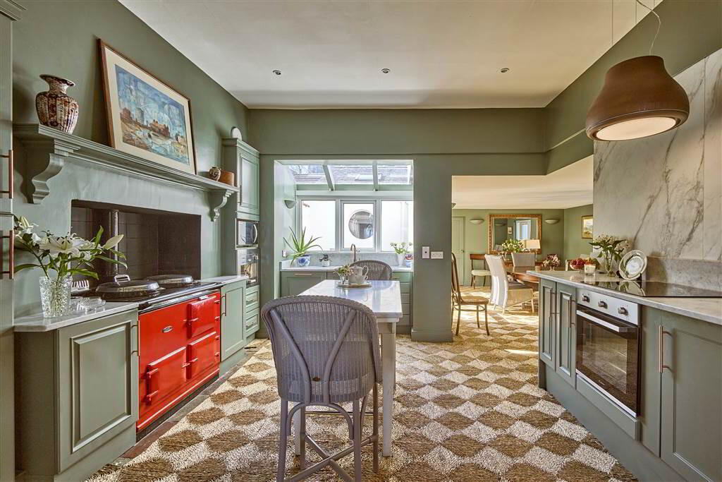 - 4.52m x 3.76m (14' 10" x 12' 4")Fitted Kitchen with a range of high- and low-level Units with complimentary Carera Marble Worktops and Upstands, an Oil-Fired Aga, an Elica Extractor Hood and Light, an integrated Bosch four ring Ceramic Hob with Oven under, an integrated Freezer and a Reginox Sink. Complete with part Tiled Walls and Chinese Slate Flooring. Open plan to: