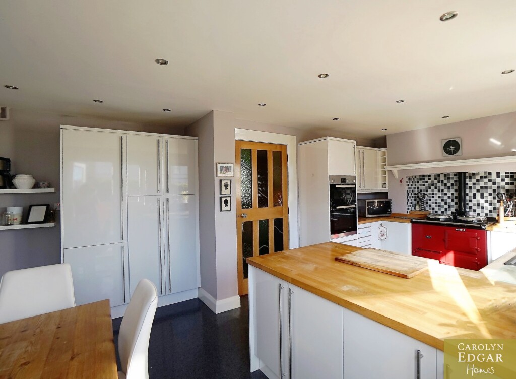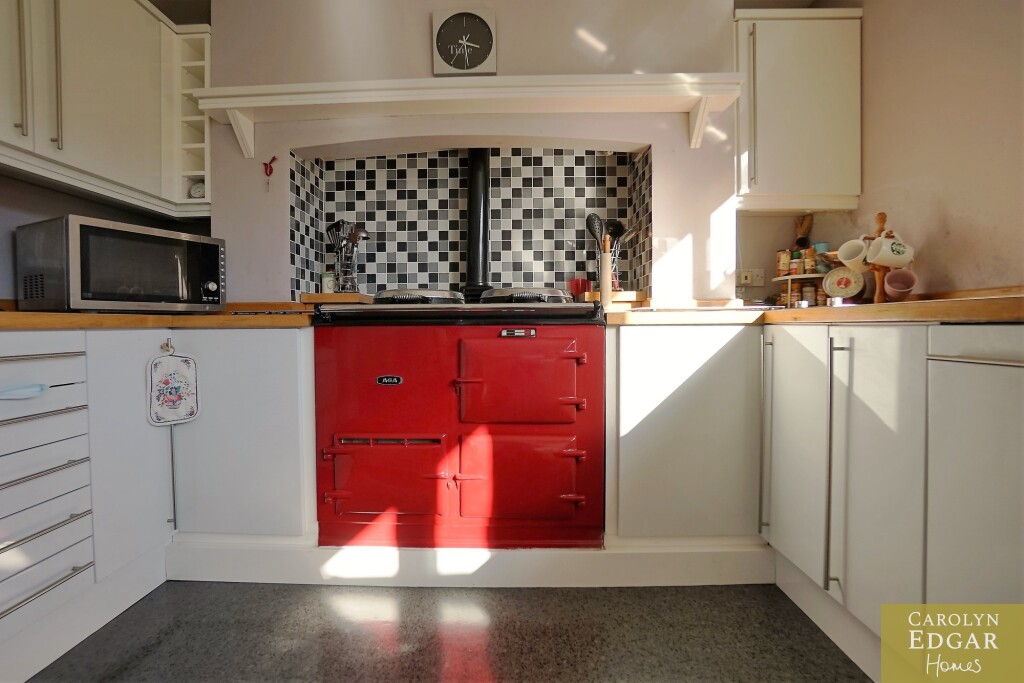 Modern Fitted Kitchen with Aga Open to Casual Dining Area