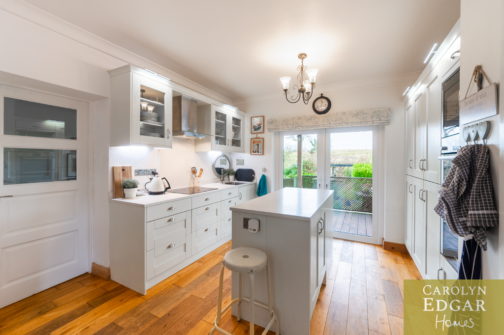 The spacious and modern open plan kitchen with dining area has an ample range of built in storage, appliances, and centre island with Minerva stone work surfaces and with French doors leading out to the veranda is flooded wth natural light and great garden views.