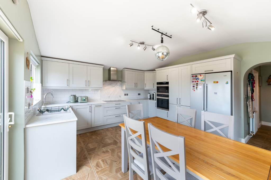 Internally, the home features a welcoming and bright entrance hallway, spacious dual-aspect lounge that floods with natural light and is enhanced by a cosy wood-burning stove, second large reception room, currently used as an office, offering that extra living space and flexibility which could easily be converted into a downstairs bedroom to meet any changing family needs. The recently installed luxury fitted contemporary kitchen has an ample range of built in units, underfloor heating and is well-equipped with built-in appliances; the casual dining area opens onto a south-facing sun terrace, perfect for outdoor entertaining. Additional features include a utility room and downstairs bathroom for added convenience and access to an integrated, double-length garage. Upstairs are three beautifully presented bedrooms, including a master complete with its own en-suite shower room and separate modern family bathroom.