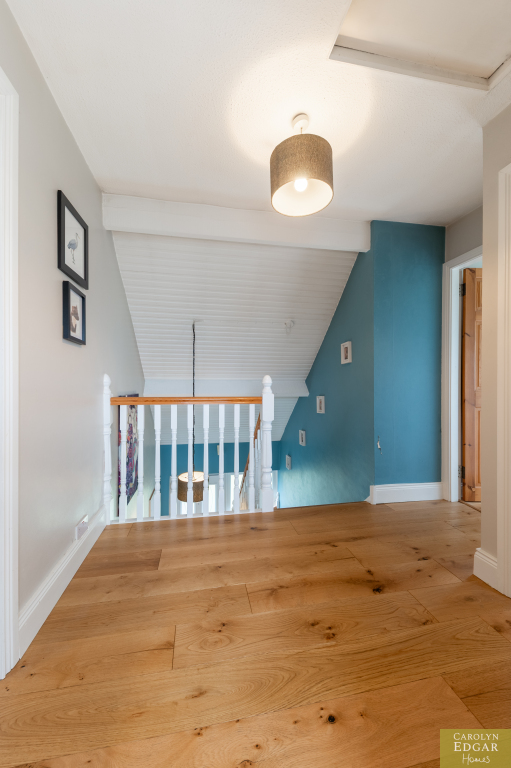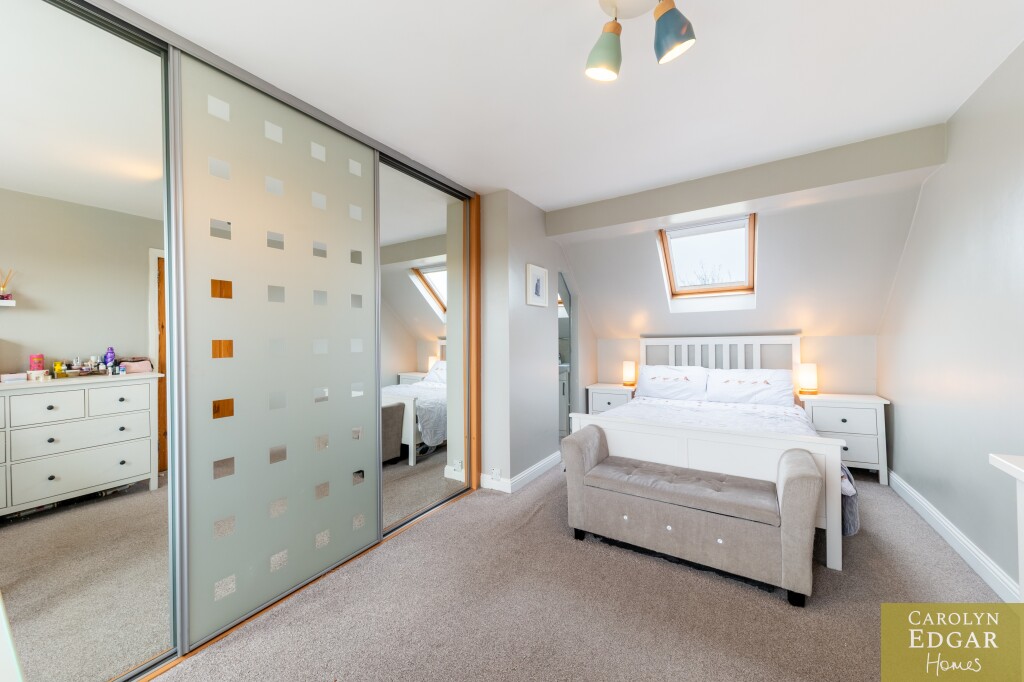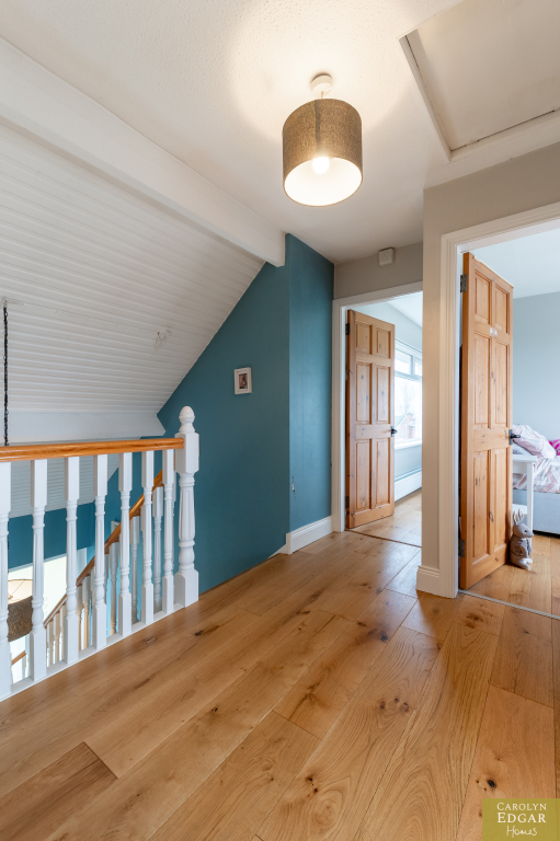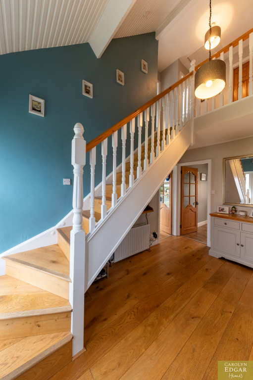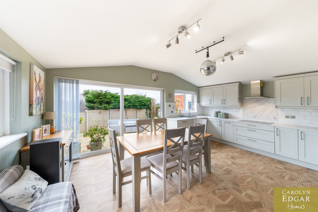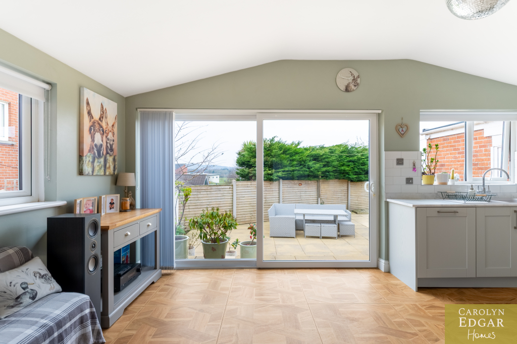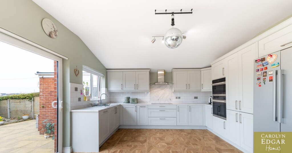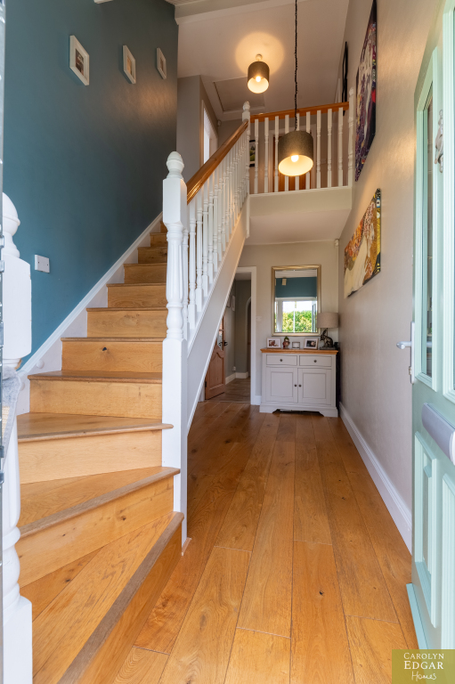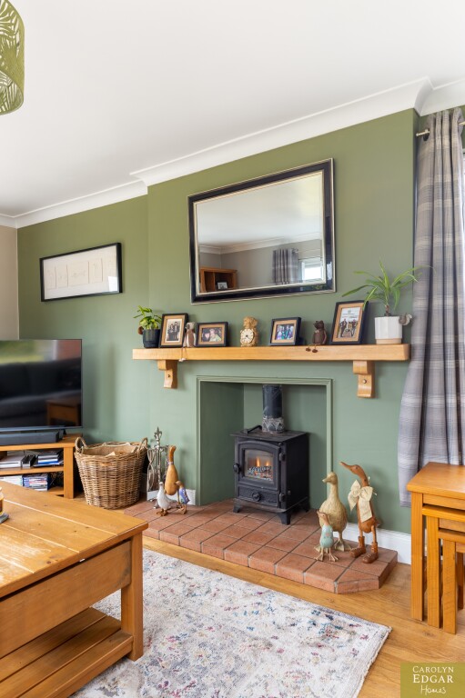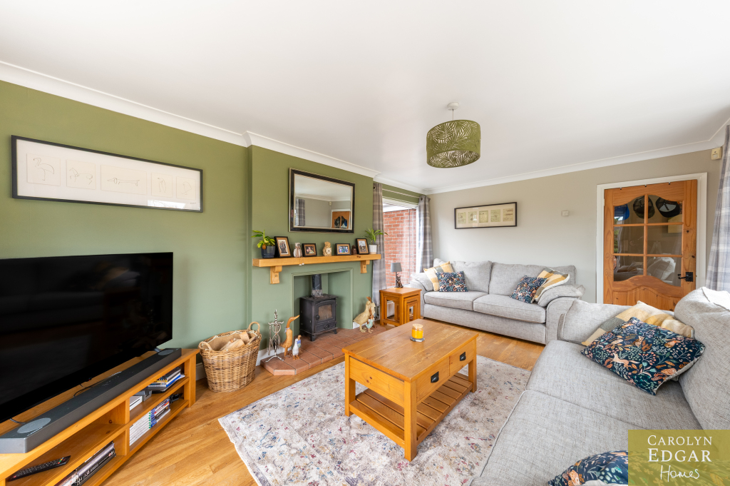 Internally, the home features a welcoming and bright entrance hallway, spacious dual-aspect lounge that floods with natural light and is enhanced by a cosy wood-burning stove, second large reception room, currently used as an office, offering that extra living space and flexibility which could easily be converted into a downstairs bedroom to meet any changing family needs. The recently installed luxury fitted contemporary kitchen has an ample range of built in units, underfloor heating and is well-equipped with built-in appliances; the casual dining area opens onto a south-facing sun terrace, perfect for outdoor entertaining. Additional features include a utility room and downstairs bathroom for added convenience and access to an integrated, double-length garage. Upstairs are three beautifully presented bedrooms, including a master complete with its own en-suite shower room and separate modern family bathroom.
