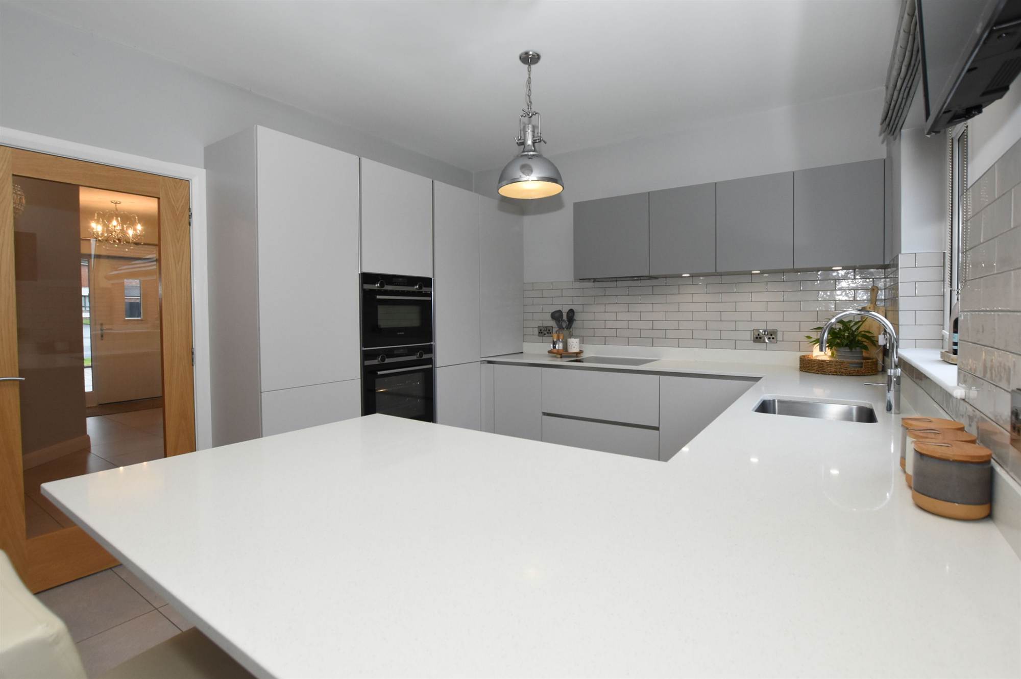 Deluxe fitted kitchen with built-in double oven, hob and extractor hood, Quooker tap and integrated fridge / freezer, dishwasher and washing machine.