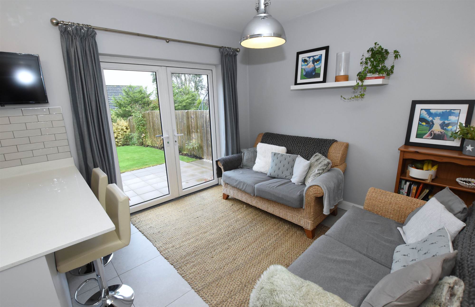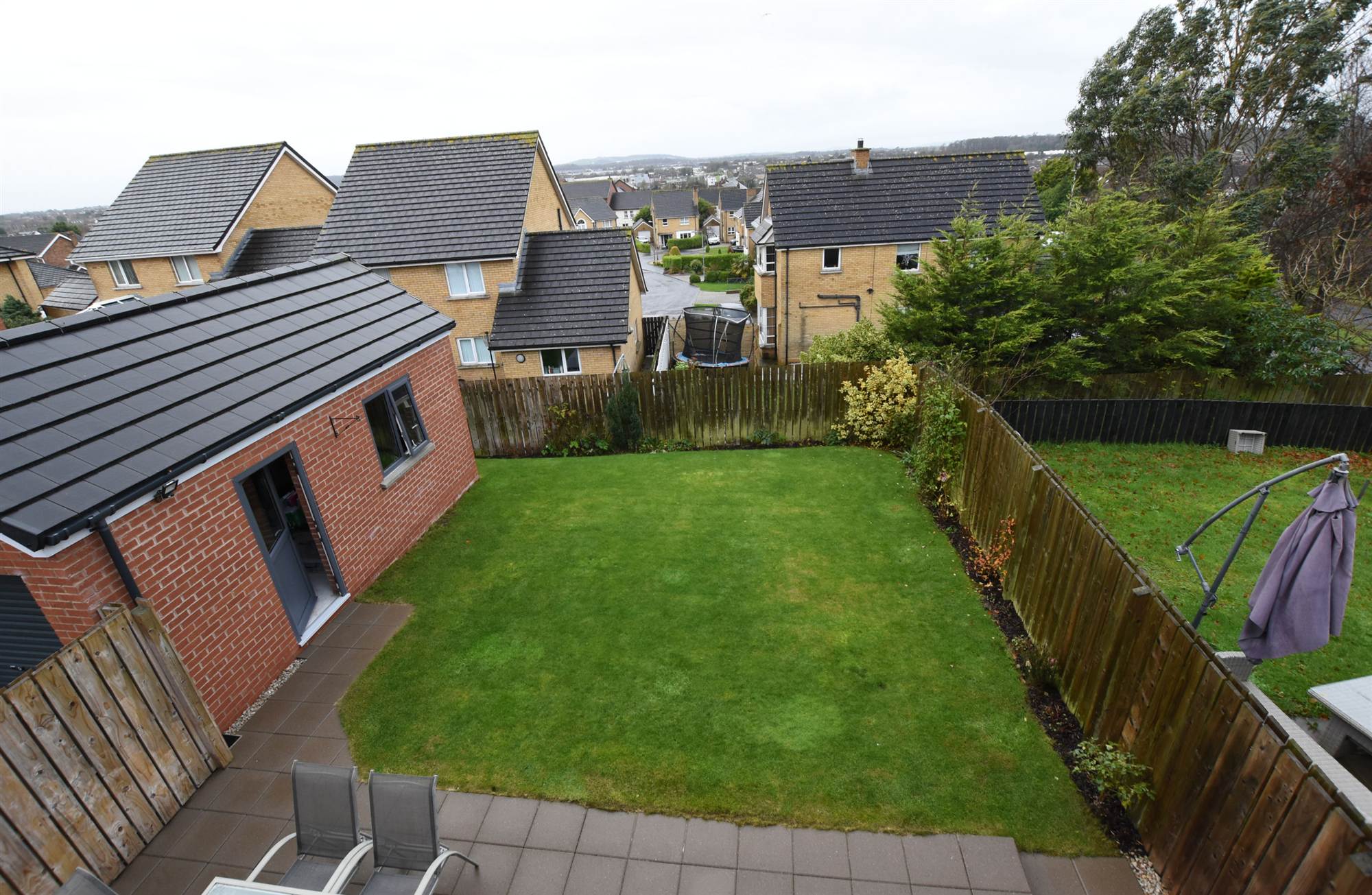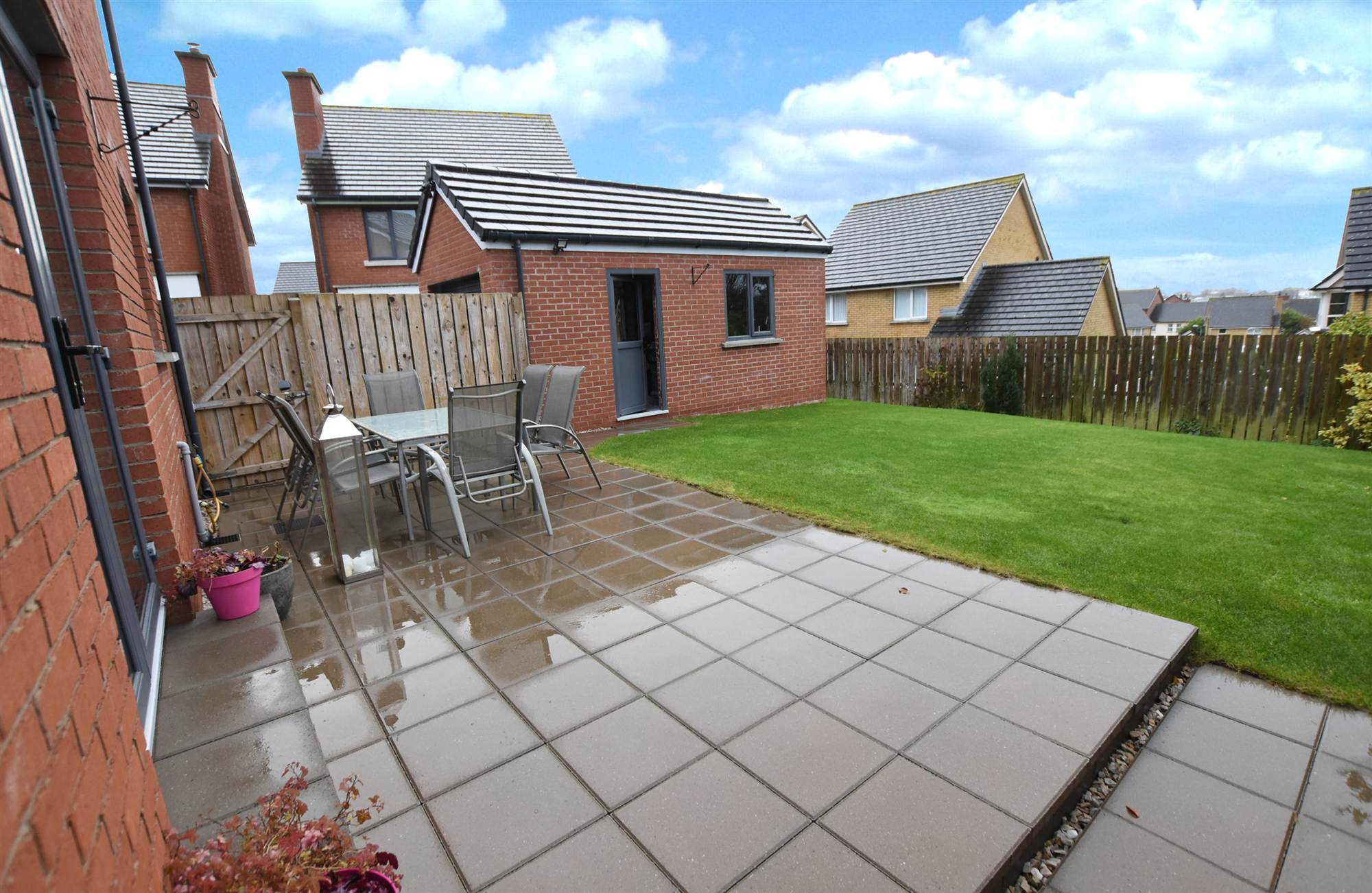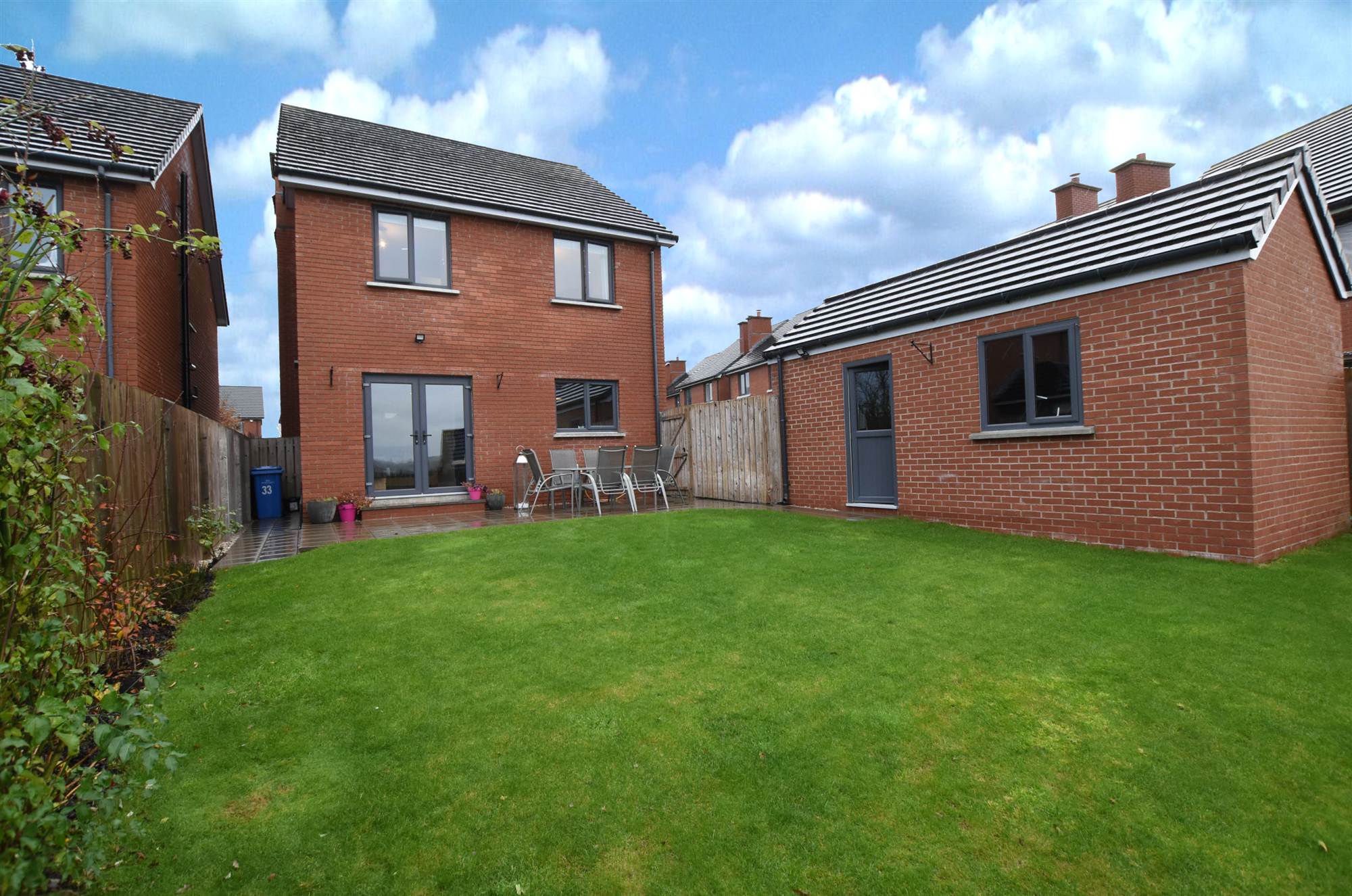 To front in lawns and enclosed rear in lawns, paved patio area, shrubs, bushes and fencing.