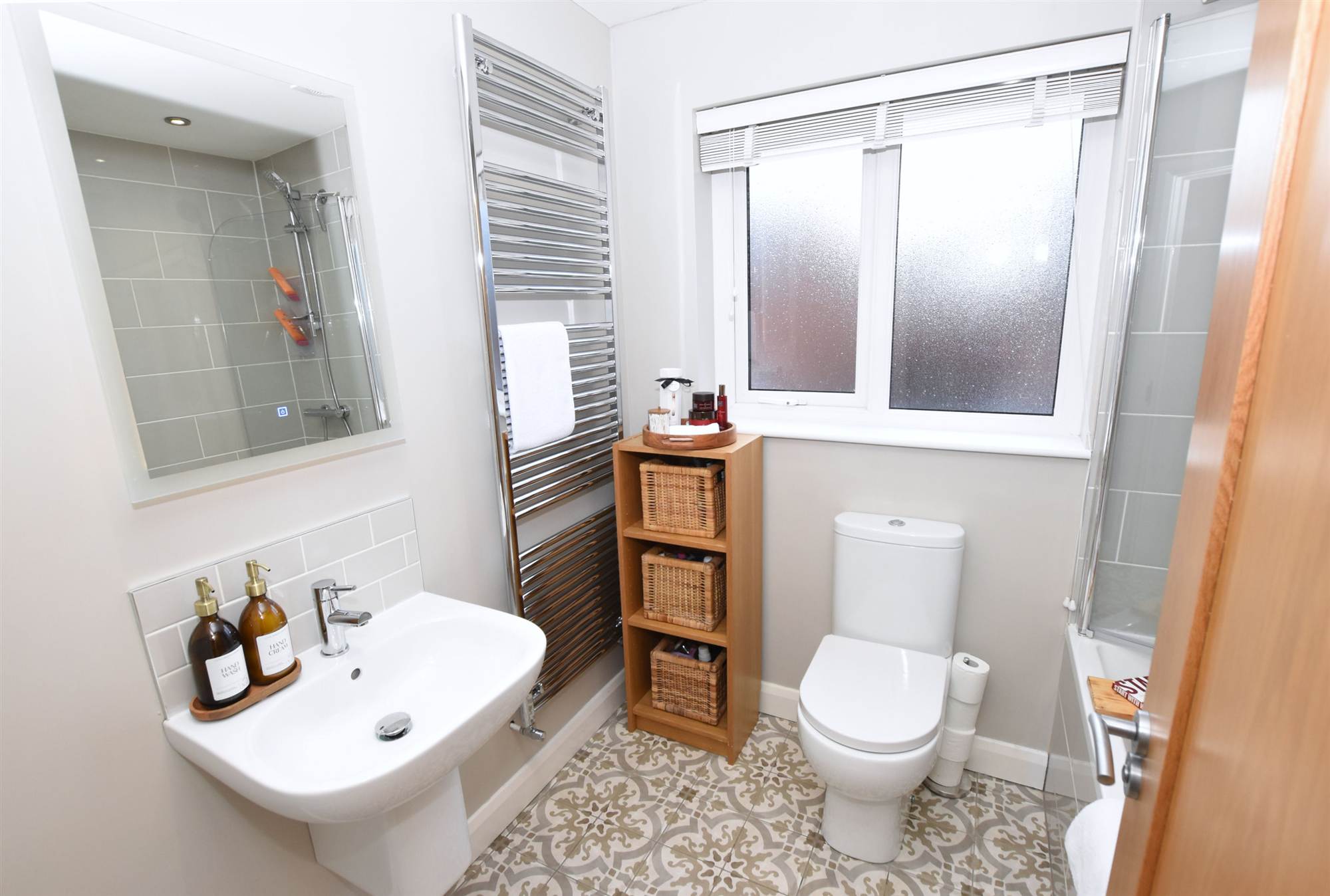 White suite comprising fully tiled shower cubicle, pedestal wash hand basin with mixer taps, low flush WC, heated chrome towel rail, ceramic tiled floor.
