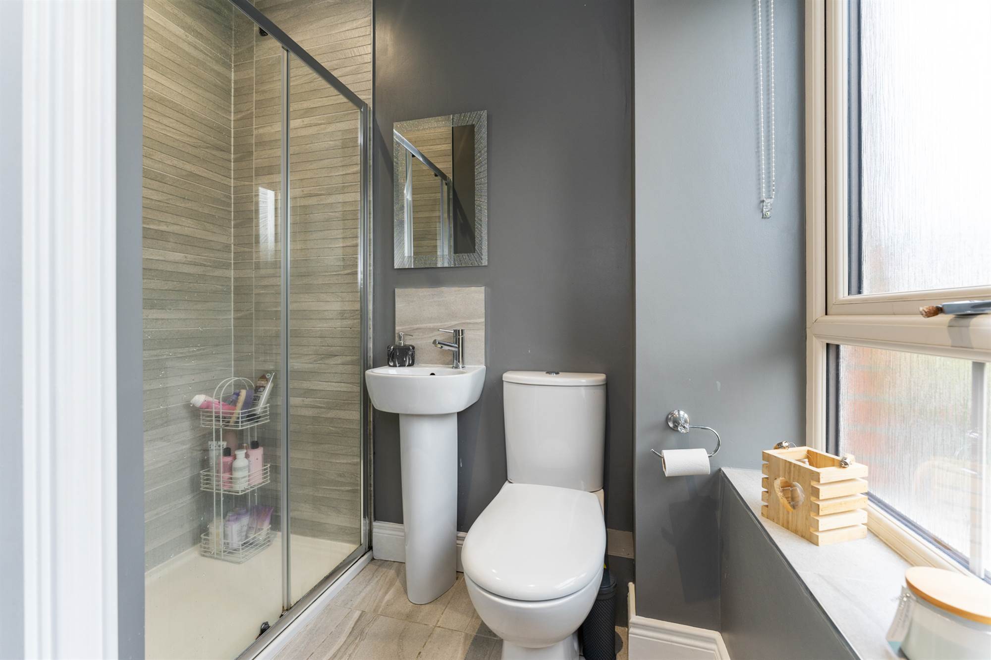 Low flush WC, pedestal wash hand basin, tiled shower enclosure, chrome towel radiator, tiled floor, recessed lighting.