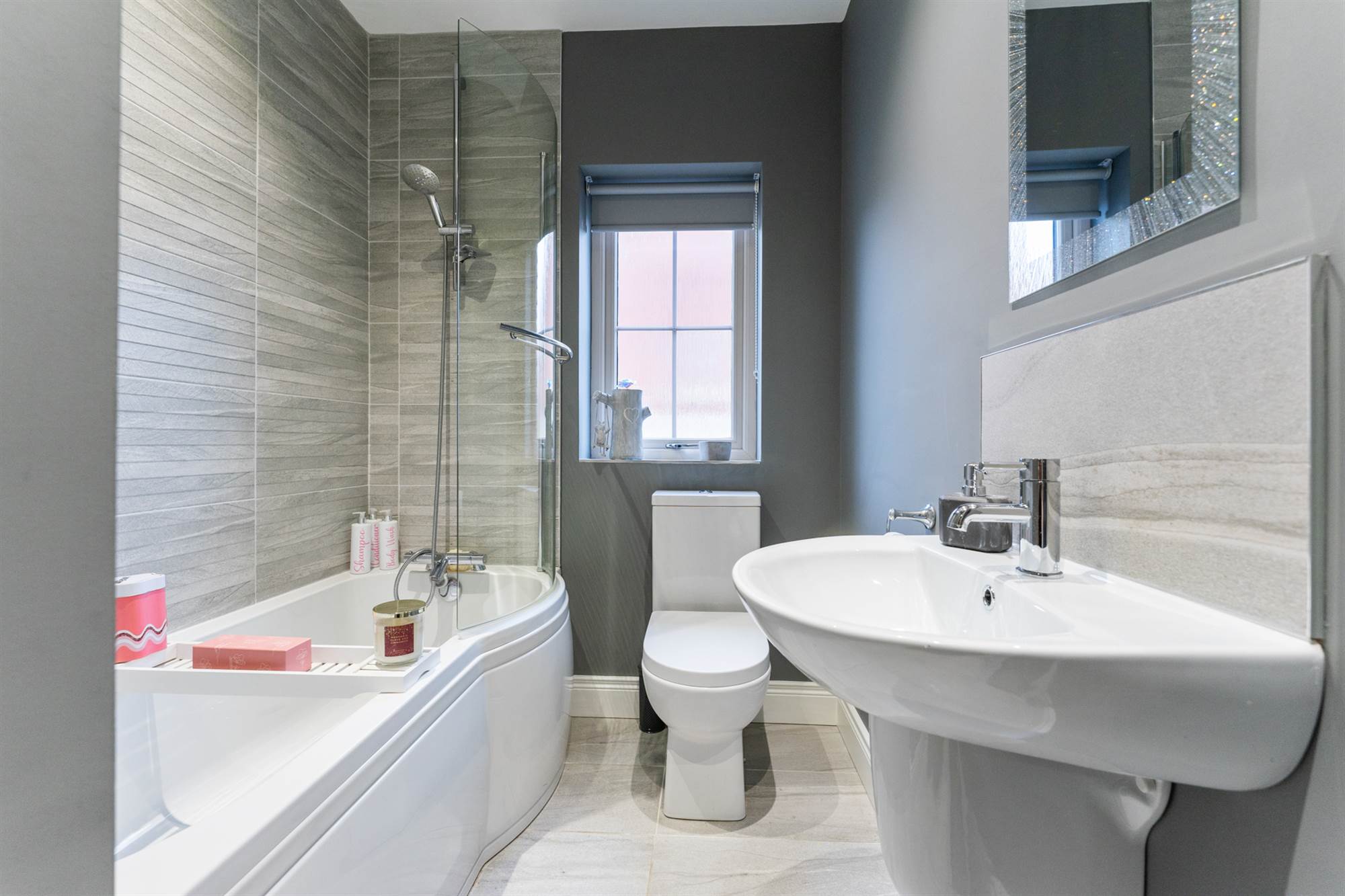 Low flush WC, wash hand basin, panelled bath with mixer taps and shower fitment, tiled floor, chrome towel radiator, recessed lighting.