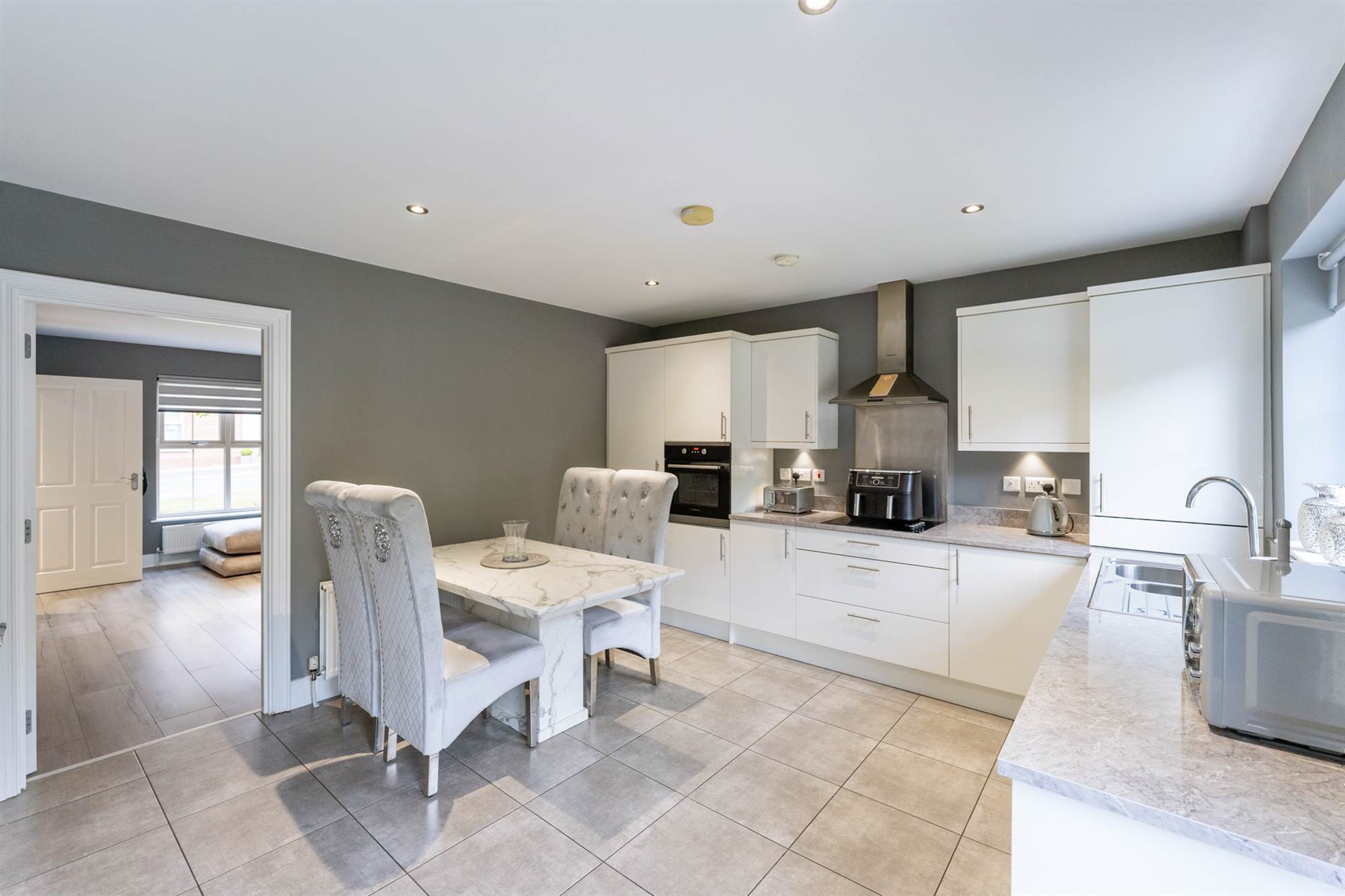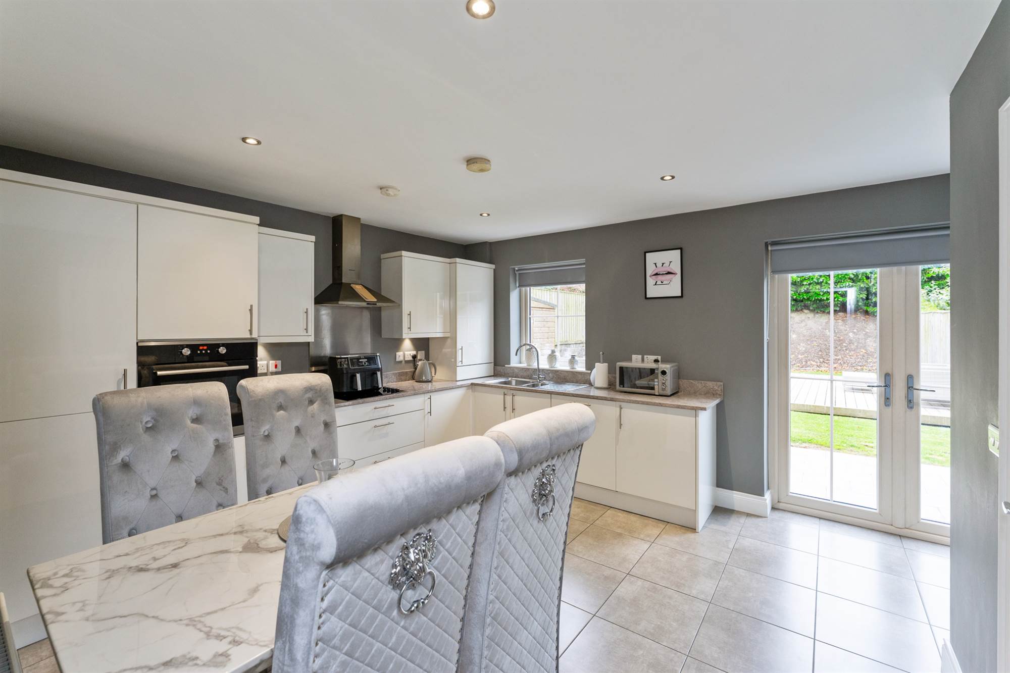 At widest points. High and low level fitted units, stainless steel single drainer sink unit with mixer taps, 4 ring induction hob and stainless steel extractor hood, integrated oven, integrated fridge freezer, integrated dishwasher, gas boiler, dining space for 4-6 people, tiled floor, recessed lighting, double opening doors to rear patio and gardens.