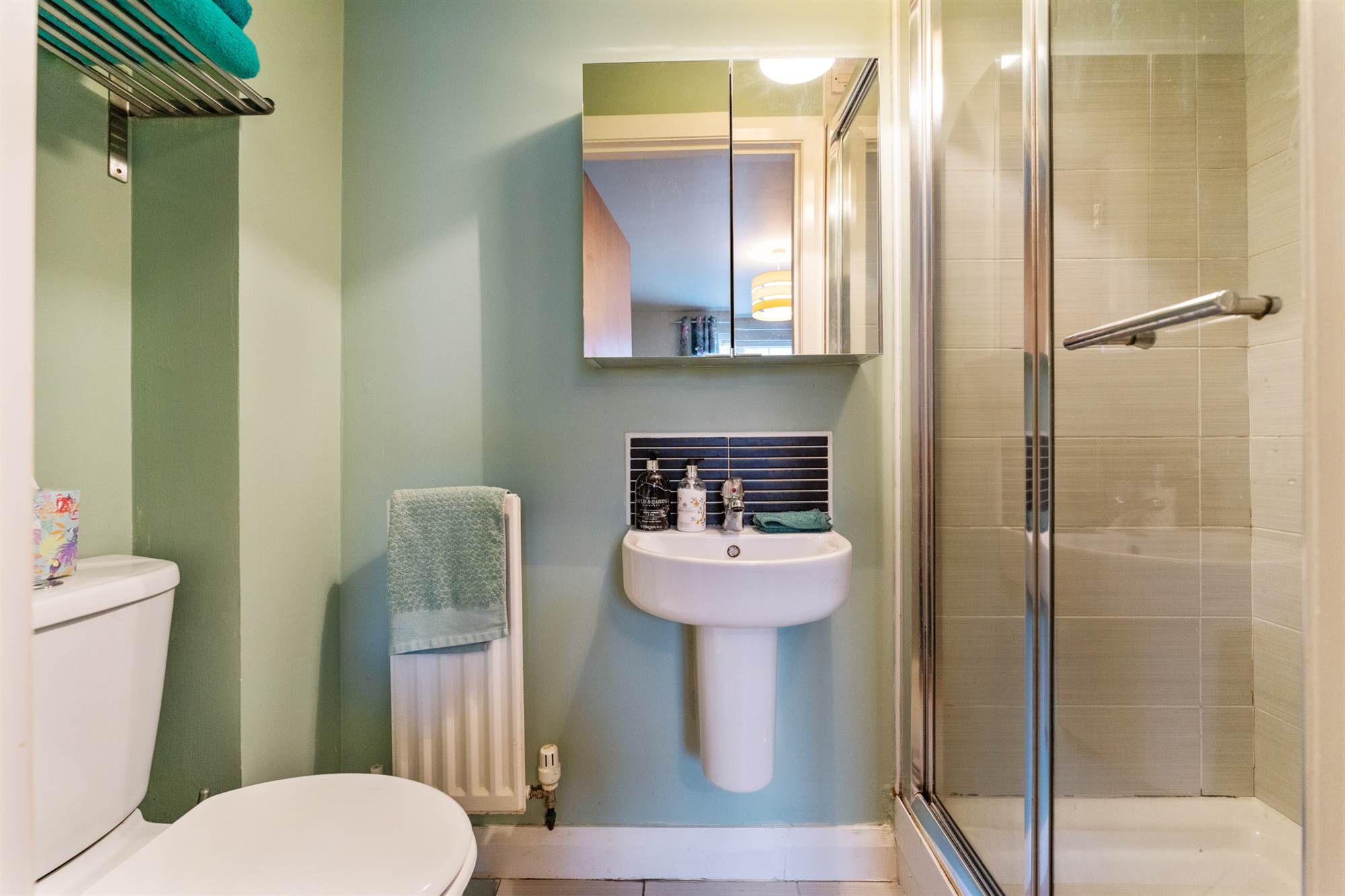 Shower unit, extractor fan, tiled floor, wash hand basin, low flush WC.